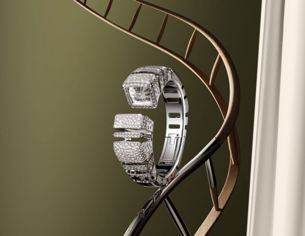这件作品独特的造型,凝聚着卡地亚精湛的制表与珠宝工艺。作品以开口手镯为灵感,构建丰盈饱满的新颖结构,镂空设计与镜面抛光结合呈现舒展的线条以及分明的棱角。开口处一侧为精美的表盘,一侧为镜面设计,隔空相对,时间仿佛在镜中逆向流转,散发无尽张力。表镜如宝石般采用斜切处理,展现此款创作既细致又精准的双重个性。