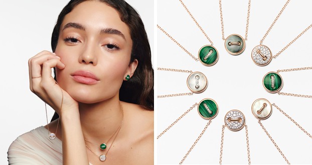 Pom Pom Dot系列所运用到的宝石,皆承载着好运与美意:孔雀石散发和谐能量,滋养内心的宁静自洽;钻石赋予佩戴者勇气与力量,无畏探索未知的可能;珍珠母贝代表健康与幸福,守护着情感的微妙平衡;而灰色珍珠母贝,则以智慧与耐心为你保驾护航,举手投足应对自如,内心绽放丰盈光采。