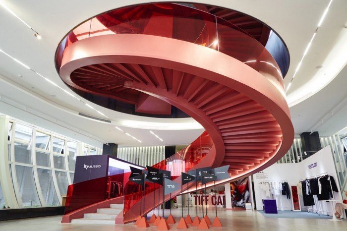 T11艺术中心是一座通透的三层楼建筑,避免因楼栋过高而对人产生压迫感,一整面垂直的玻璃外立面则让室内的空间能最大程度的引入自然光线并享有绝佳的视野,与室外景观和园区内的其他楼栋形成更紧密的联动关系。最吸引眼球的,无疑是在一楼中央伫立的红色旋转楼梯,串联起各楼层的同时又像是空间内一座极具未来感的艺术装置,呼应着整个中大门蓬勃向上生长的朝气。除了一楼和二楼的品牌专属订货空间,整个三楼的空间也被完全重塑,打造为本次T11 Showroom的秀场空间,4月15日和4月16日,凭借秀导对于品牌设计理念的梳理,辅以造型师在这一梳理基础上对不同单品的精彩混搭,风格迥异的各大品牌,通过几场大秀完整呈现了设计师在这一季中想要表达的设计语言。台下的受邀观众,也纷纷举着手机,在一动一静之间捕捉每个造型的完美角度。