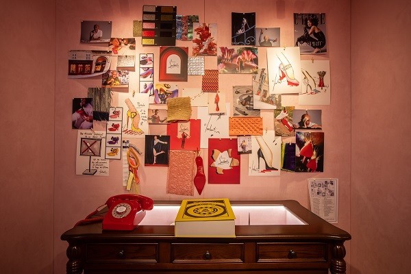 体验空间中再现了品牌创始人兼设计师Christian Louboutin先生位于巴黎的工作室的局部场景,引领观众重温标志性红底鞋诞生的里程时刻。现场还原的办公桌上不仅展示着历史上的第一双红底鞋,工作室场景内亦通过具有历史意义的物品陈设与展示于墙面的部分鞋履草图,共同讲述了Christian Louboutin先生设计生涯的缘起经历与创作以来的一个个独特故事。其中,藉由放置于办公桌上的复古红色电话拨打专属号码,亦可聆听Christian Louboutin先生和新任品牌代言人杨幂的亲切留言。