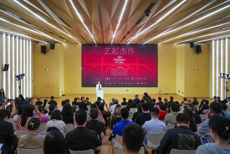 在4 月 16 日《艺起“杰”作》武汉站展览的开幕式上,聚集了众多业界代表。著名词作人、艺术家方文山,武汉美术馆馆长陈勇劲,展览总策划、总监制沈天舒,展览总策划兼学术顾问李诗晨(Jazz Li),联合策展人周净(Roena Zhou)等分别发言,开幕式由武汉美术馆副馆长裴少菲主持,并由武汉市文化和旅游局副局长杨菁宣布《艺起“杰”作》展览正式开幕。在场嘉宾共同见证了这一艺术盛宴的启幕。