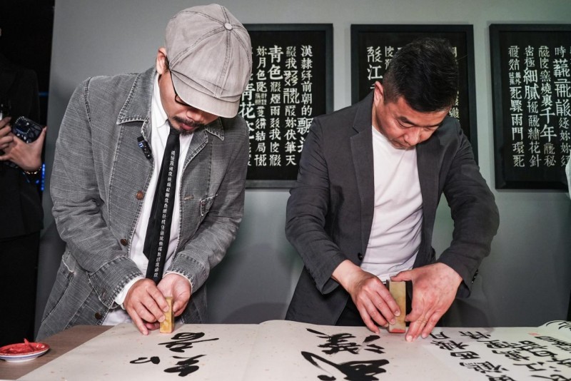 《艺起“杰”作》武汉站开幕式 方文山(Vincent Fang)与武汉美术馆馆长陈勇劲 共同为写有”知音武汉“的书法册页作品盖章