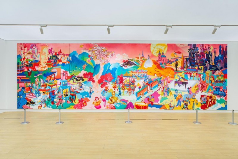 《翻玩范特西Parody of Jay's Music》蔡赟骅,布面丙烯,800 x 250 cm,2019; 《艺起“杰”作》武汉站展览现场,©WEF EEL ART