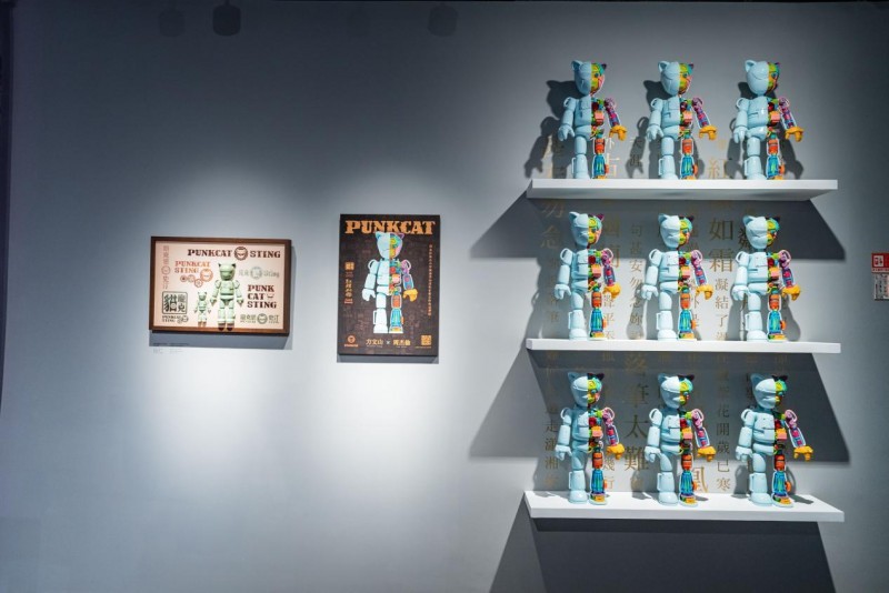 《庞克猫史汀LOGO父子框》(图左一),方文山,综合媒材与木,68 × 45.5 × 6 cm,2022;《艺起“杰”作》武汉站展览现场,©WEF EEL ART