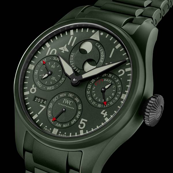 2024年5月15日,沙夫豪森:IWC万国表推出大型飞行员TOP GUN海军空战部队万年历腕表“森林绿”。这款配有46.5毫米绿色陶瓷表壳的腕表是IWC万国表历史上首个搭配同色陶瓷表链的表款。万年历自动识别不同的月份长度,并在每四年的二月底增加一个闰日。IWC万国表自制52616型机芯采用陶瓷部件组成的比勒顿自动上链系统(Pellaton),两个发条盒可保证7天的动力储存。精致复杂的机芯透过蓝宝石透明玻璃表背尽显风采。