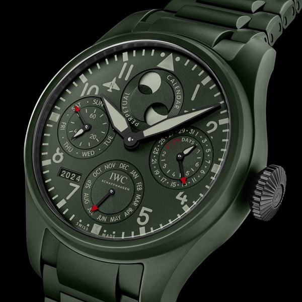 IWC万国表于2022年推出了“TOP GUN色彩”系列飞行员腕表,并采用全新彩色陶瓷,如“森林绿”(Woodland)和“太浩湖”(Lake Tahoe)。这些丰富的颜色均以海军航空领域的色调为灵感,并与彩通(PANTONE®)合作开发完成。今年,IWC万国表为该系列新增一款万年历作品。