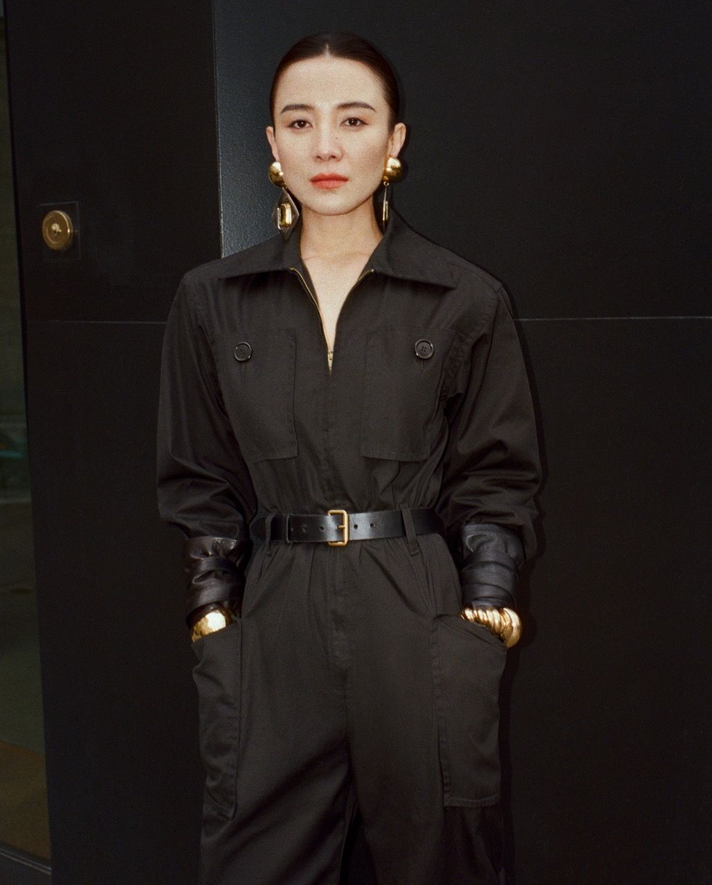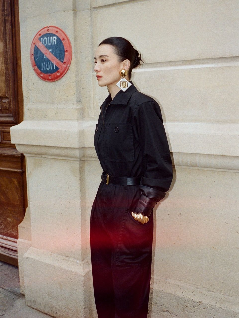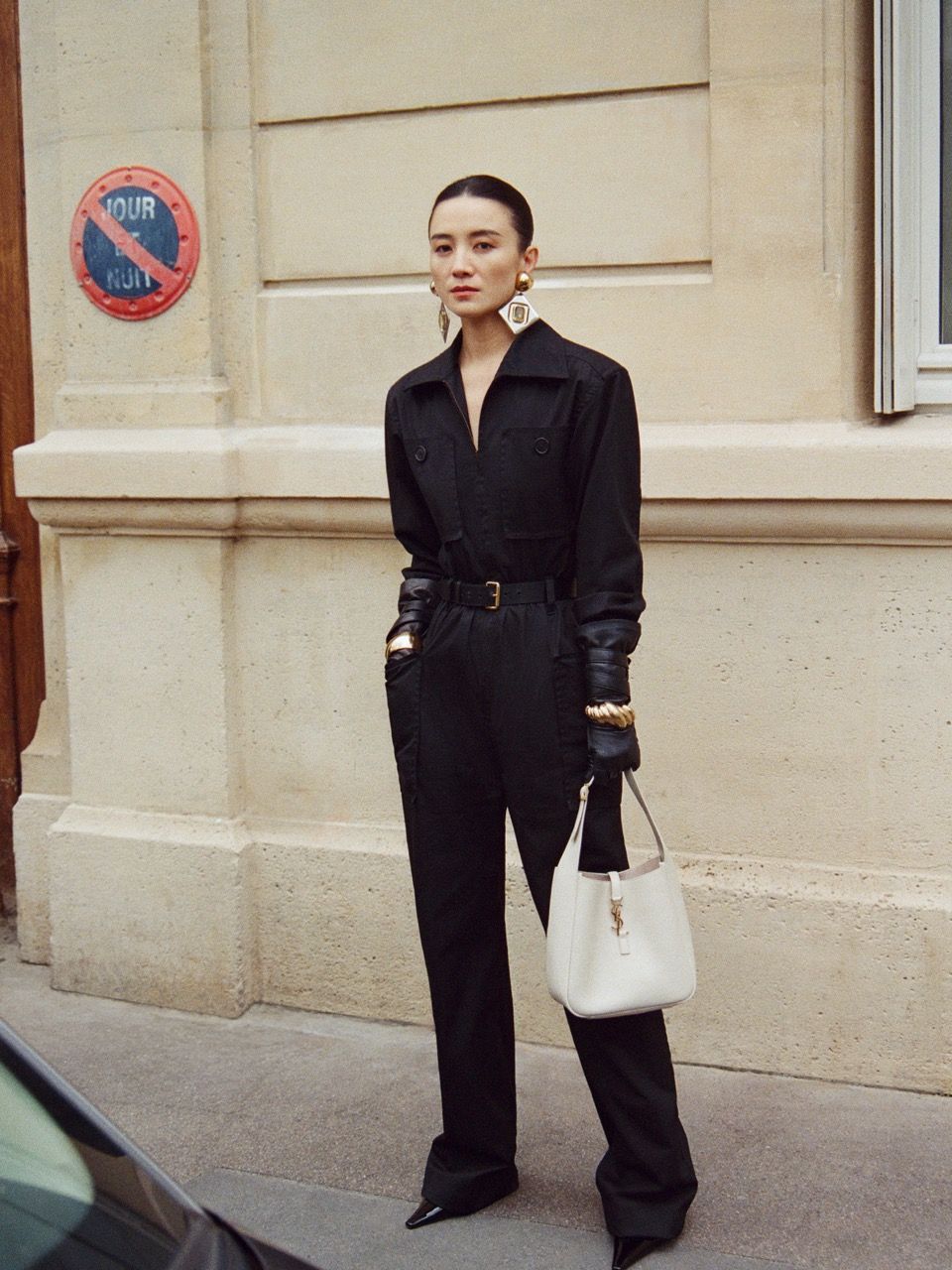 演员宋佳于巴黎身着SAINT LAURENT圣罗兰2024夏季女士系列连体裤装,佩戴飞行员皮手套、金属手镯及耳环,演绎LE 5 À 7小号柔软肩背包。