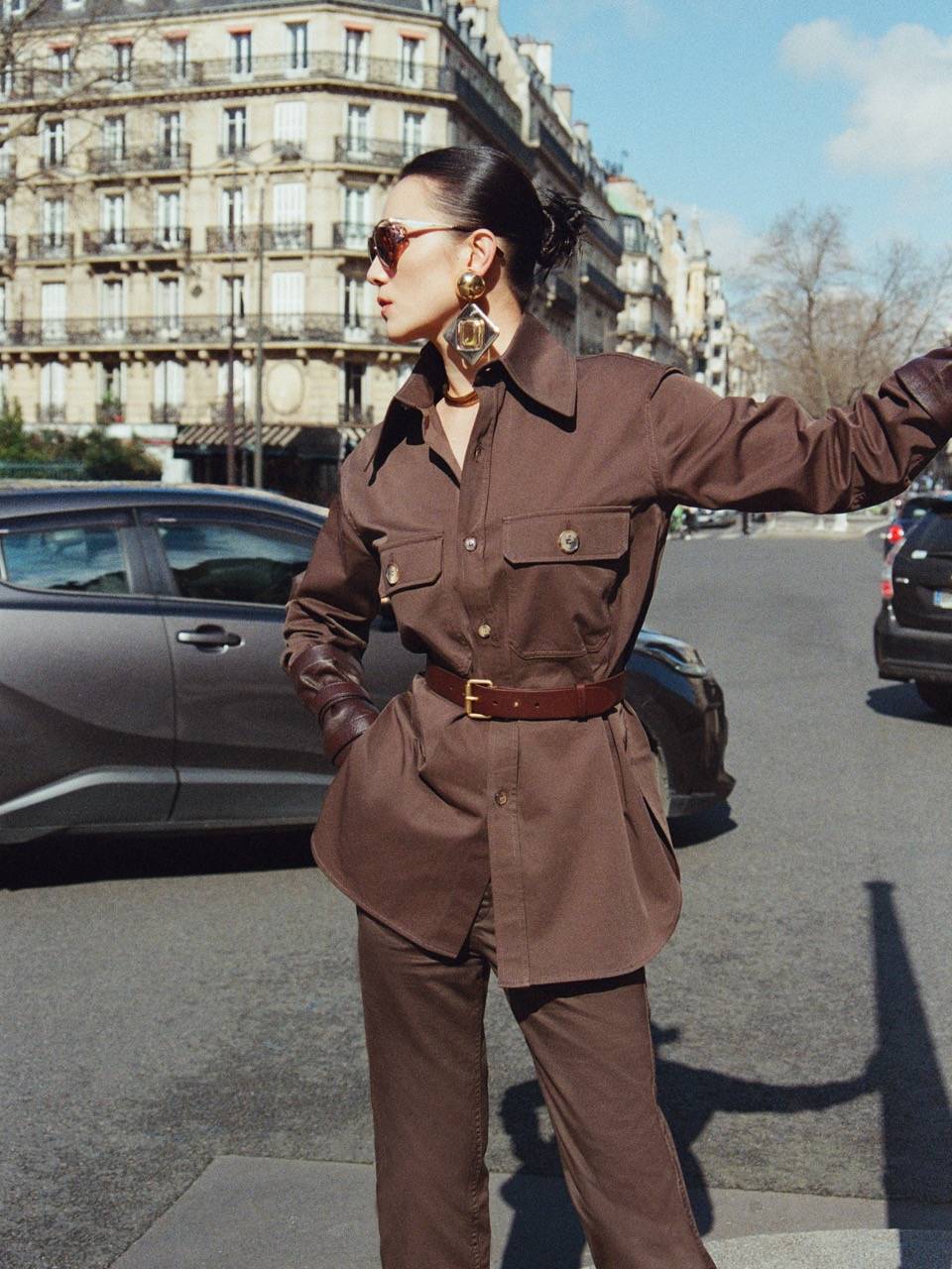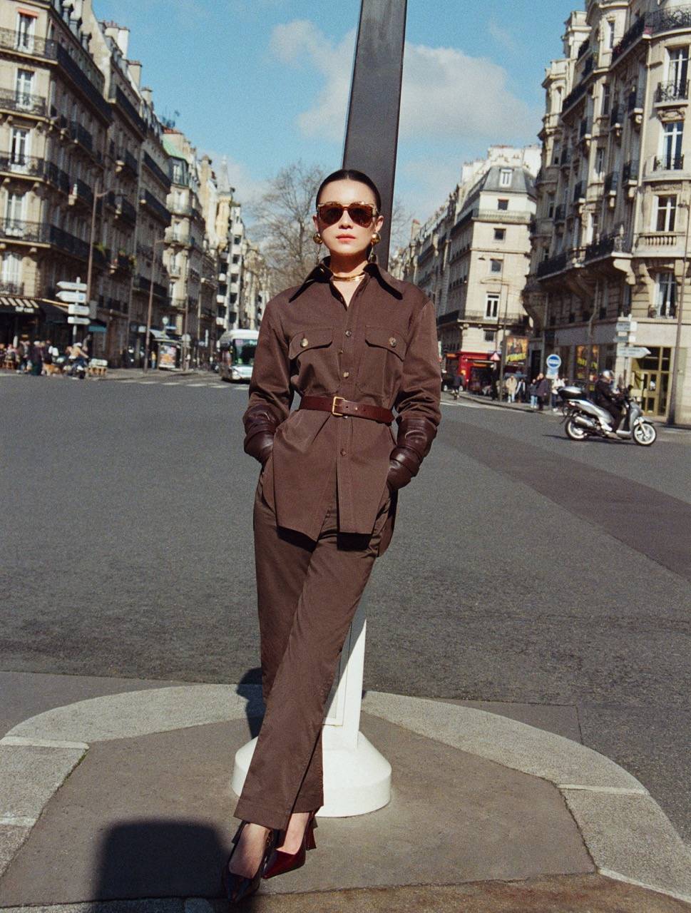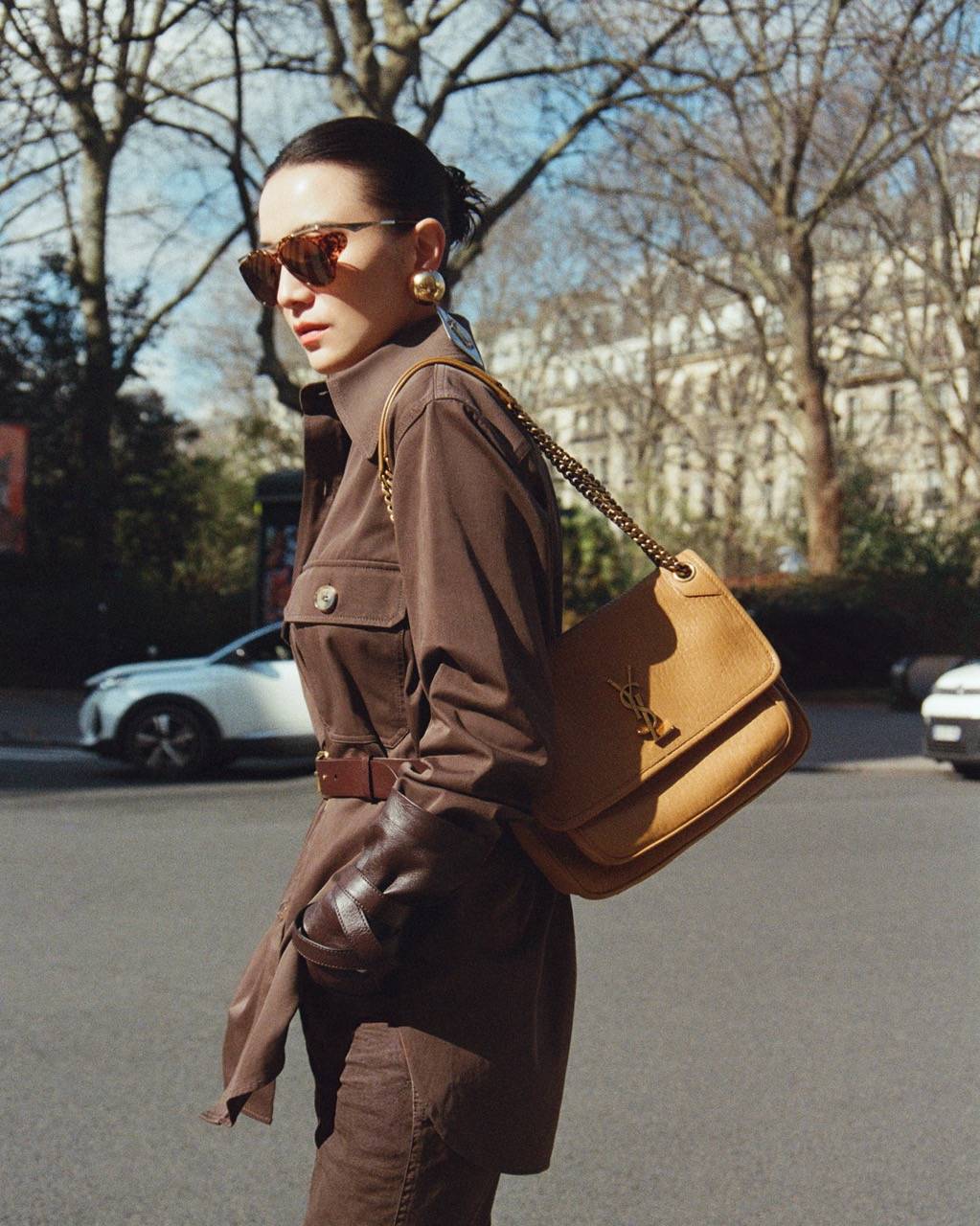 演员宋佳于巴黎身着SAINT LAURENT圣罗兰2024夏季女士系列贴袋衬衣、剪裁长裤,佩戴飞行员皮手套、金属手镯、耳环及AMELIA飞行员太阳镜,演绎NIKI中号粒面羊皮革手袋。