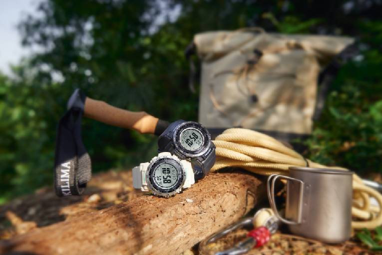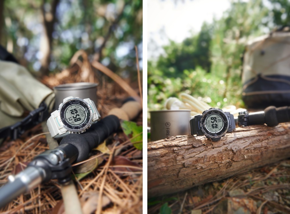 此次,在PRO TREK带来的两款登山手表中,PRW-35-7采用米白色表带搭配银色金属表圈,视觉上经典且百搭。表壳边缘还特别点缀绿色,以一抹亮眼色彩唤醒无限生机;