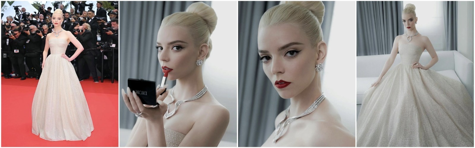 迪奥全球时装与彩妆品牌大使ANYA TAYLOR-JOY,身着一袭轻盈薄纱长裙,勾勒自信绰约姿态,复古精美妆造,尽释典雅之美。