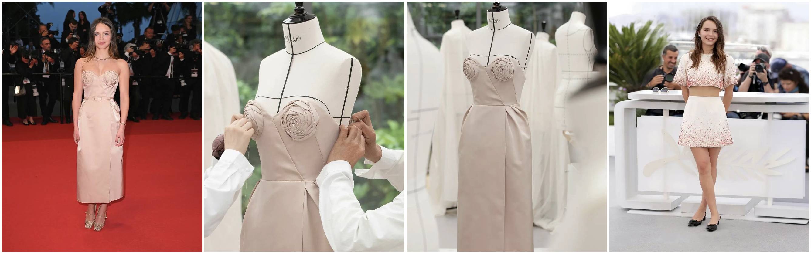 演员MALLORY WANECQUE身着迪奥高级订制礼服裙亮相戛纳电影节红毯。精致褶皱如花卉般绽放于淡粉色丝质半身裙之上,散发柔美淡雅气质。