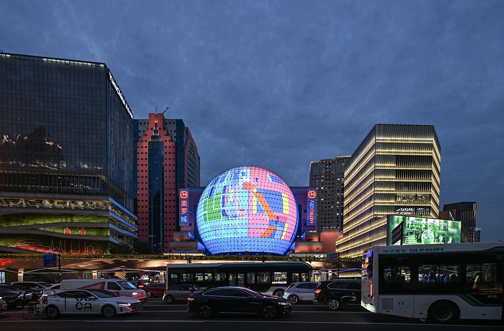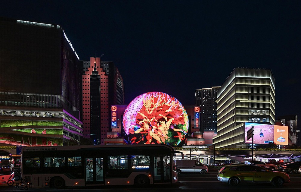 不仅如此,今年“夜次元——夜道碰头”艺术项目还在美罗城设置了一处特别单元,名为“光之乐 | Sound of Lights”。在我们日常所触的信息流中,视觉与听觉通常相伴出现,听觉往往成为视觉的补充与诠释,成为信息传达的配角媒介。此次项目在无法播放声音的表现媒介中尝试以声音为创作主体,由长期活跃在新媒体与影像视听艺术领域的毕振宇、分号C、李政钟+念子轩、苗晶、莫佳青、沈琪与王志鹏,各自挑选一段旋律送给城市的夜晚,并将其以视觉作品的形式在美罗城的“美罗元宇宙”球形屏幕上呈现。令视觉成为声音的传达工具,以期触发一场跨感官的奇妙体验,让观者在视觉的绚烂中“听见”艺术家送给城市的夜语。