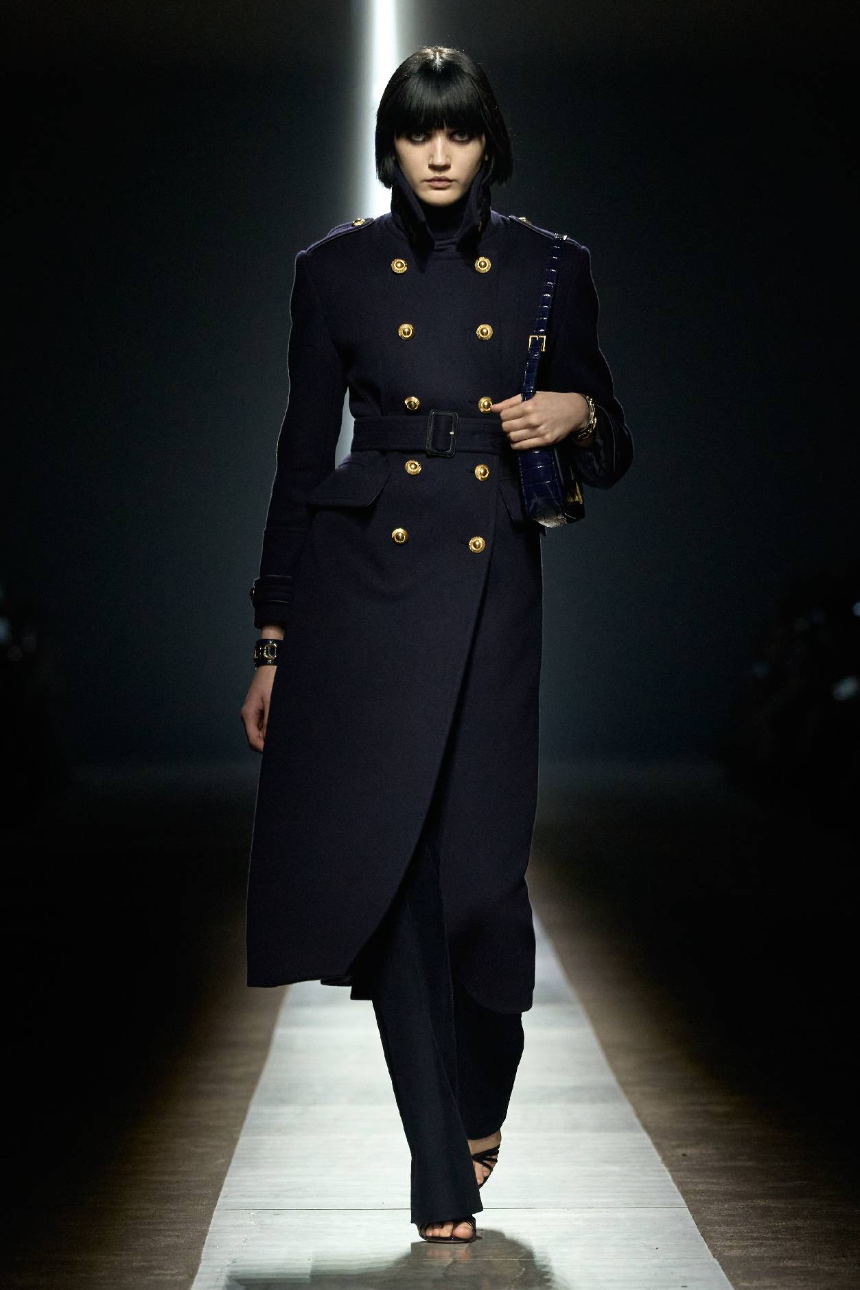 黑色、海军蓝和白色是主要的色调,从帕尔马色到紫外线色的多种紫色调则作为鲜靓的点缀。金色则以华丽的面料或金属饰品的形式呈现。不同的面料赋予不同的设计深度和触感,为其增添了独特的亮点:麂皮、专利皮革、羊毛、轻盈的缎面针织、羊毛丝混纺斜纹、光泽的巴拉西亚纱、丝绒面料、丝绸和羊毛混纺等。