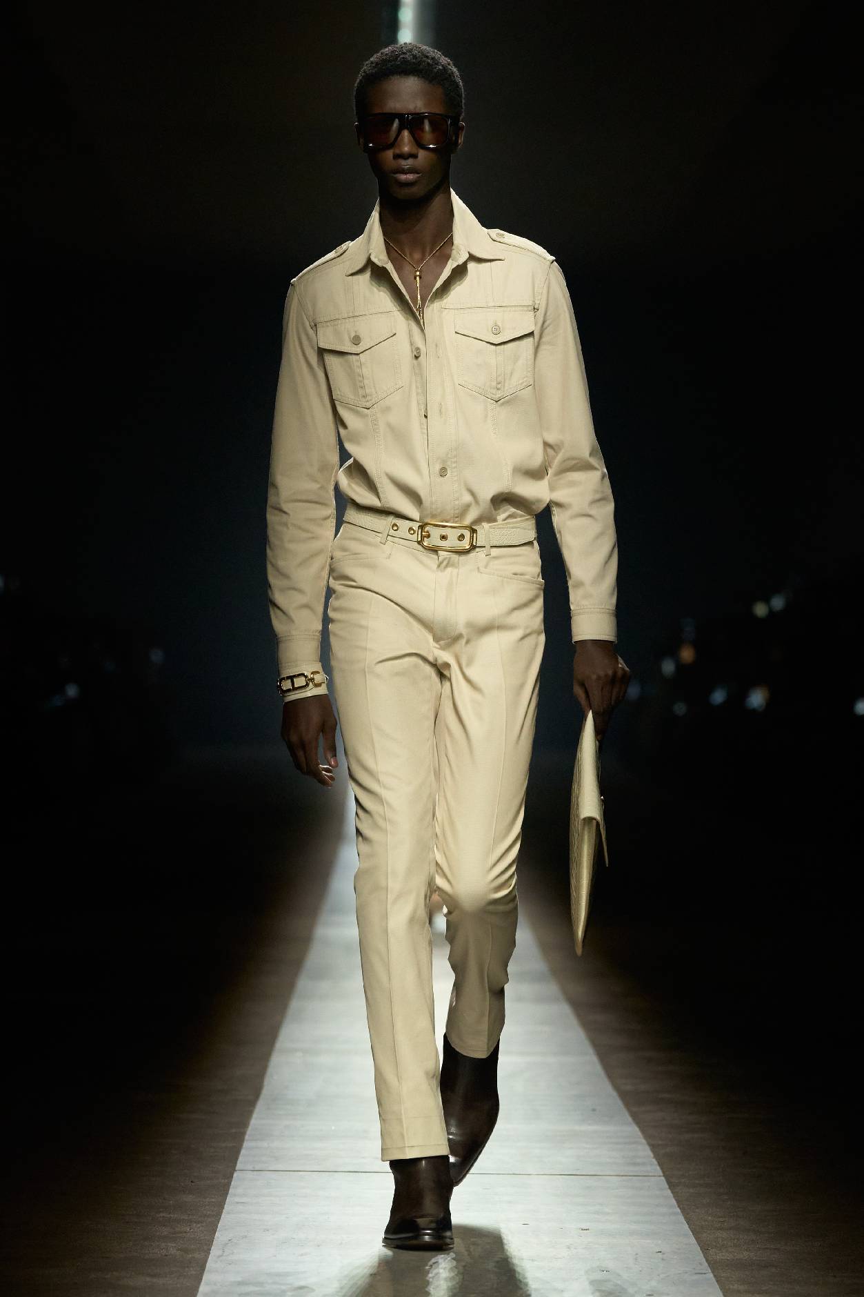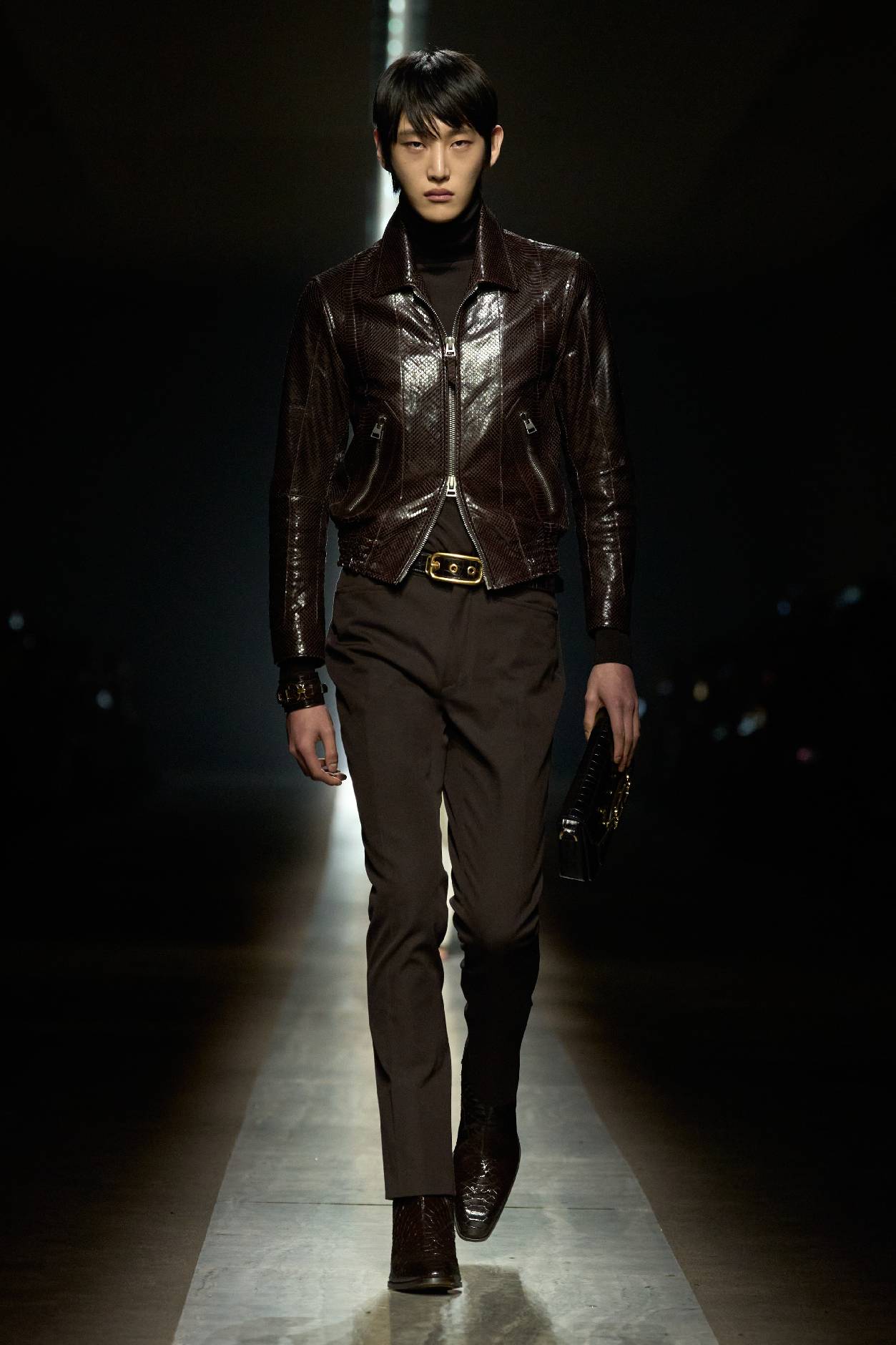 2024 冬季系列再次展现了TOM FORD理念的锋芒毕露和强大形象。修身版型和丰富纹理的结合,流苏的耀眼光芒、无可挑剔的剪裁以及柔韧挺括的皮革等元素展现出独特的设计风格。西装外套和短裤的搭配展示了轻松慵懒的迷你裙风格。以军装为灵感的大衣既干练又性感。连衣裙长短不一,隐约展现出身体的曲线美。