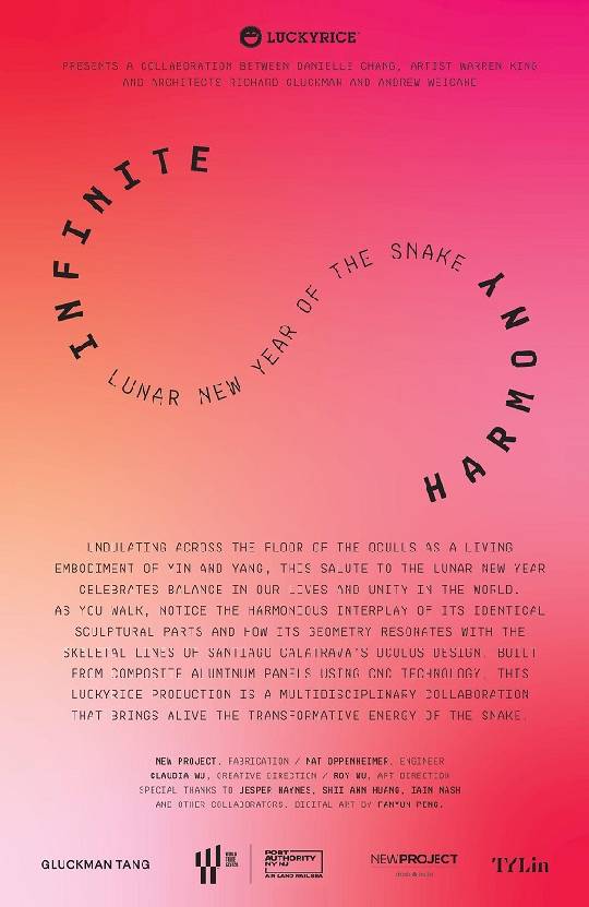 装置雕塑主体由著名建筑设计师 Richard Gluckman 和 Andrew Weigand 联手设计,全长约150英尺(约45.7米),结合The Oculus建筑师Santiago Calatrava(圣地亚哥·卡拉特拉瓦)基于“骨骼式”设计理念而打造的内部空间蜿蜒而行,象征着生命的循环与重生,装置与场域形成巧妙呼应。此外,“无限蛇”艺术装置还邀请到纽约多媒体艺术家彭凡芸(Fanyun Peng)加入数字互动体验,为主题打造增强现实(AR)滤镜。即便观众无法亲临其境也可通过社交媒体平台,例如TikTok、Snapchat等,拍摄短视频或照片,实现线上线下海内海外全球同贺新春。