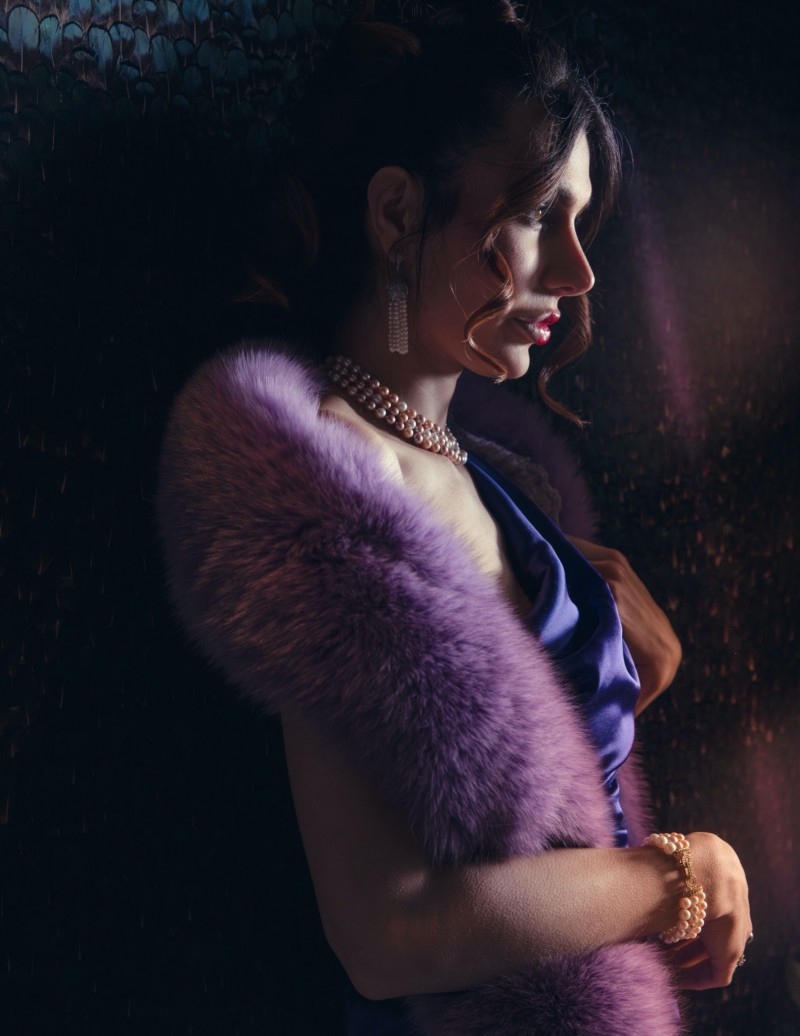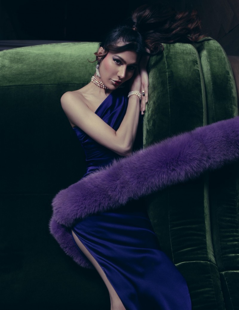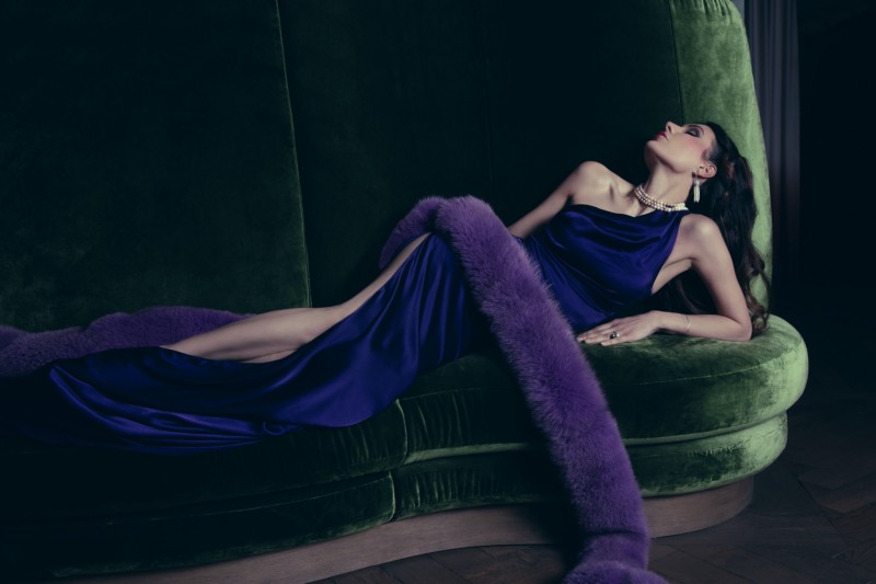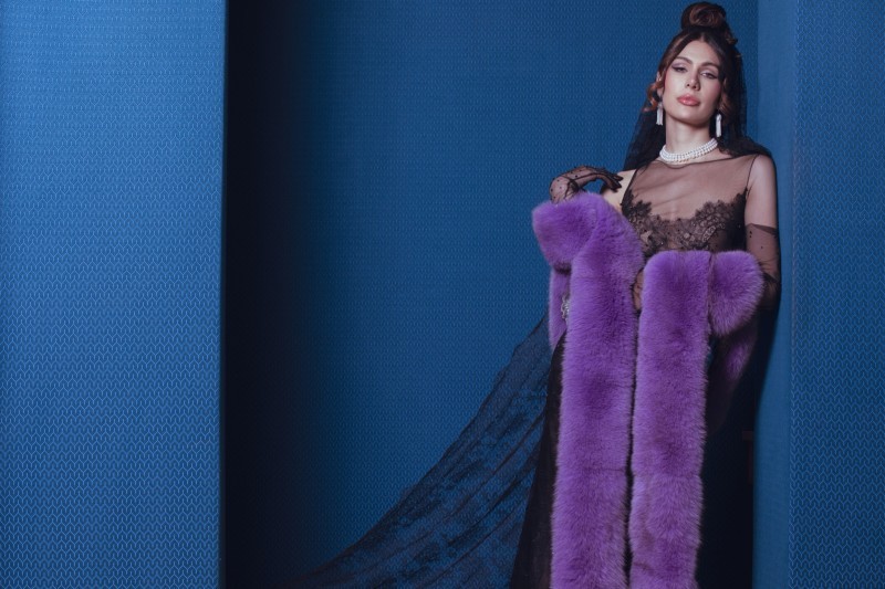 尤为引人注目的是那条环绕在身侧的紫色狐狸毛披肩,毛绒细腻丰盈,色泽浓烈而神秘。它的存在为整体造型注入了一抹戏剧性的优雅,犹如夜幕中绽放的紫罗兰,为这冷艳的蓝色礼服带来了温柔与华丽的对比。