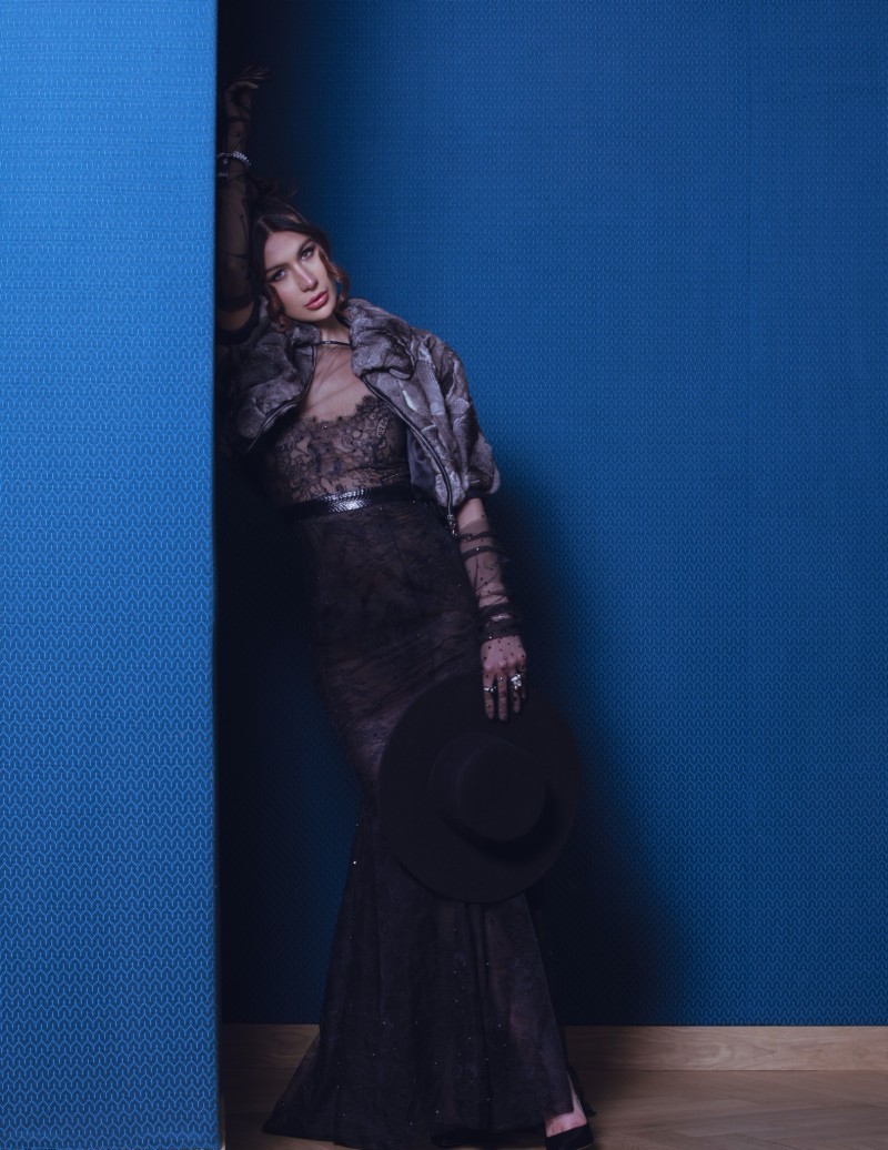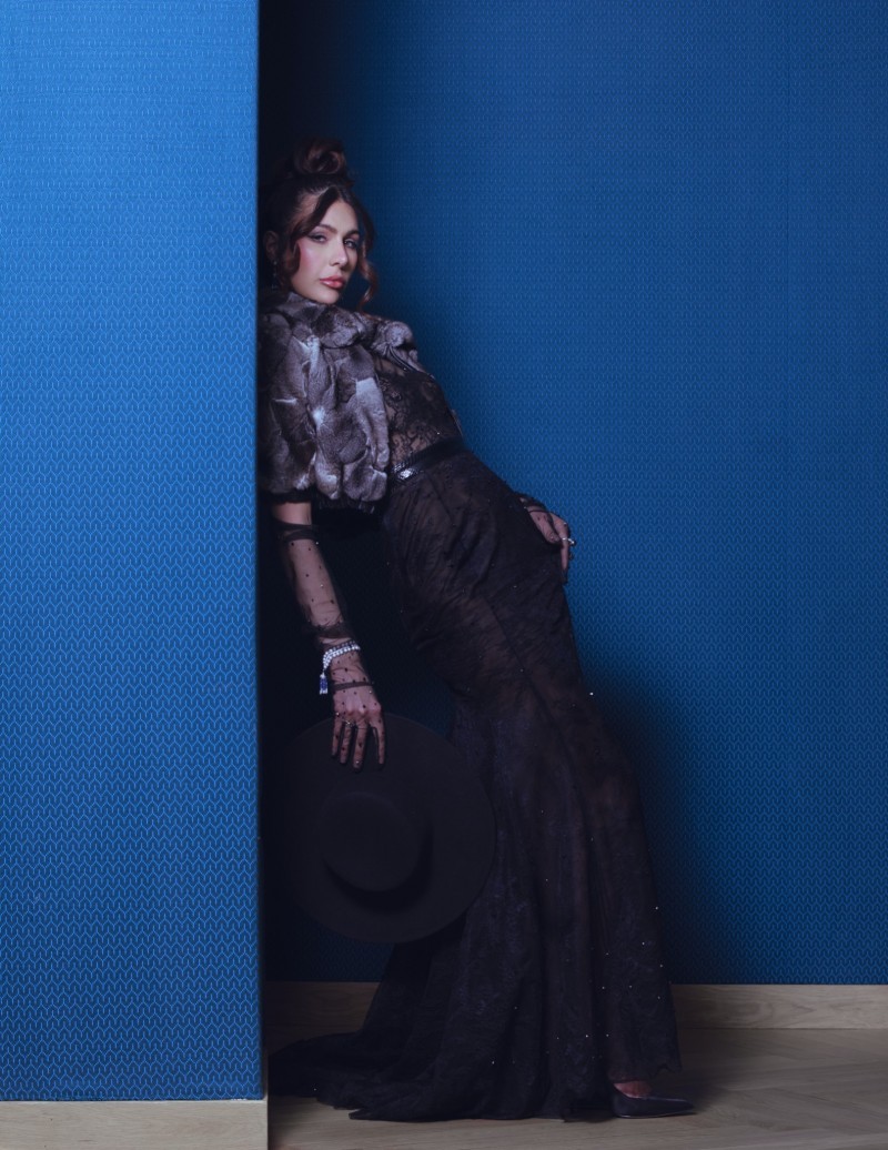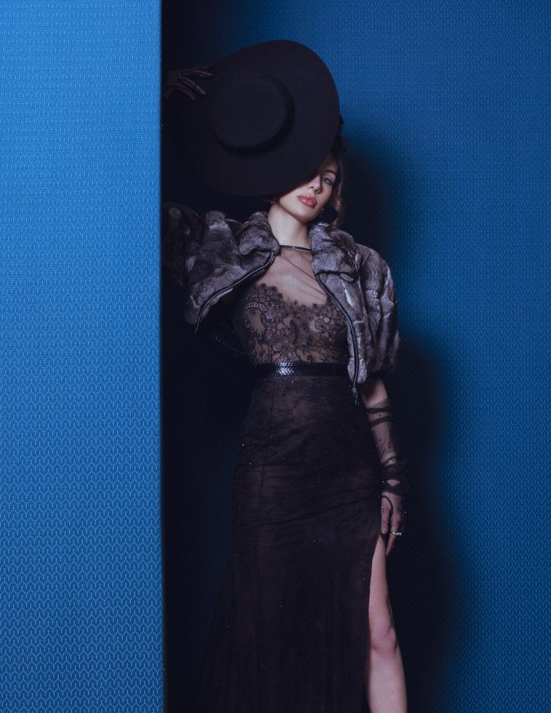 Look 4 这款礼服以法国蕾丝勾勒索尼娅·曼苏尔的完美曲线,若隐若现间展现神秘优雅。手工刺绣与蕾丝拼接交织,尽显端庄大气。蓝色,如深海般幽邃,如夜空般静谧,在光影流转间幻化莫测,与华美丝绒般珍贵裘皮交相辉映,仿佛打开一扇通往未知世界的时空之门,引人步入镜像迷宫。黑色水蛇皮腰带巧妙拉伸整体比例,赋予造型冷艳气质,宛若暗夜公主,在午夜的苍穹下绽放魅惑光彩,诠释女性的妩媚与神秘。