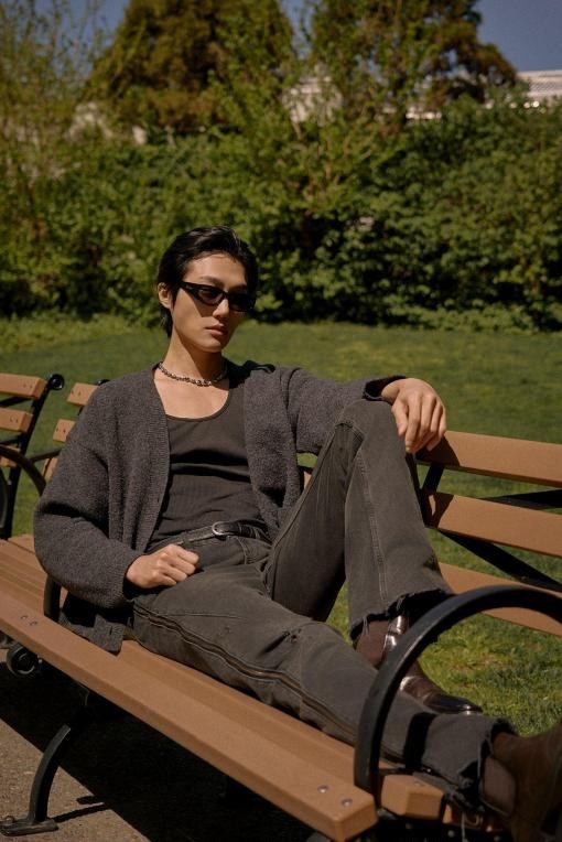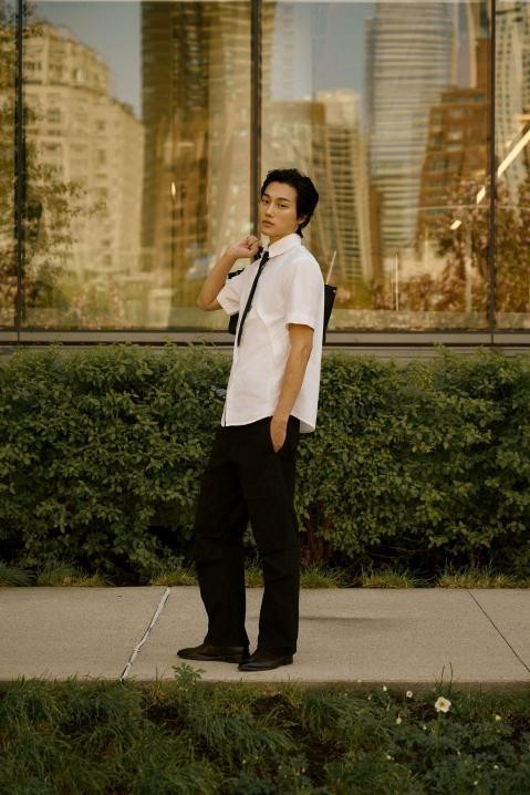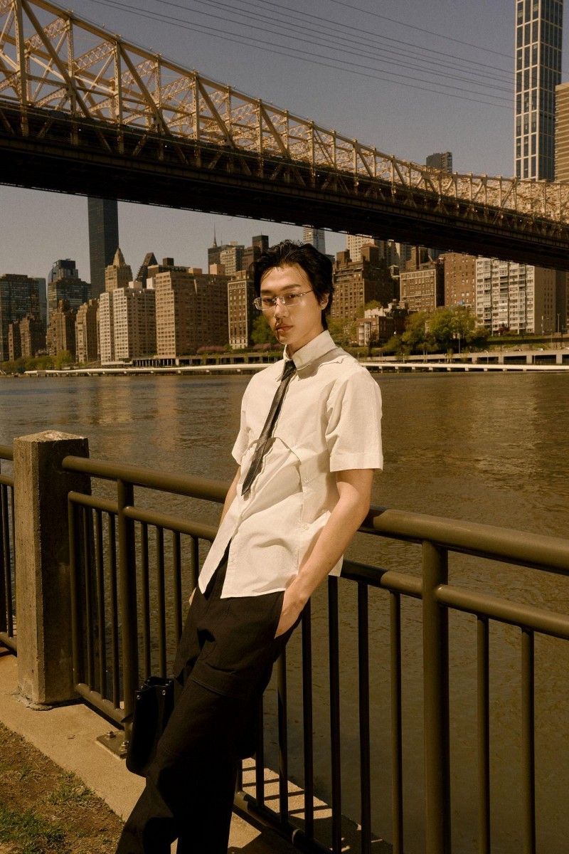 在清晰与模糊之间,在规则与自由之间,他停留在那片无声的空隙中。穿梭于城市的绿地、水岸与桥影下,他用服装记录每一次内心的波动——白衬衫、领带与挺括的黑色包袋,是对秩序的微妙呼应;松散的针织开衫、手工编织感的背心,则是对自我表达的温柔偏离。
