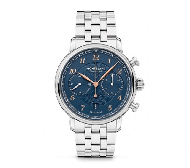 这枚万宝龙新款明星系列计时码表限量发行1786枚,腕表的鹅卵石形表壳采用精钢材质打造,直径42毫米。蓝色的表盘中央饰有特殊的印花图案,仿拟冰晶熠熠纹理,这一设计的灵感来自勃朗峰山脉最具代表性的冰海冰川。盘面上搭配有镀玫瑰金色阿拉伯数字时标,与蓝色盘面搭配,更显华贵。腕表内部搭载的是内含计时器功能和为日期显示提供动力的MB 25.13自动上链机芯,可通过蓝宝石水晶玻璃表背一览无余,机芯的动力储存长48小时。