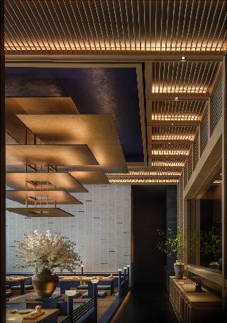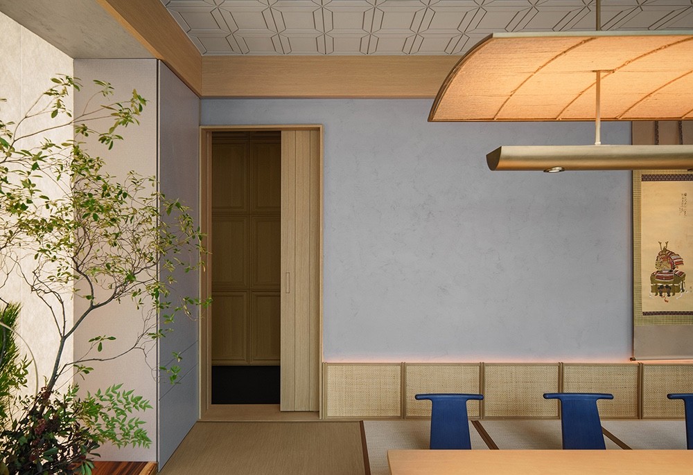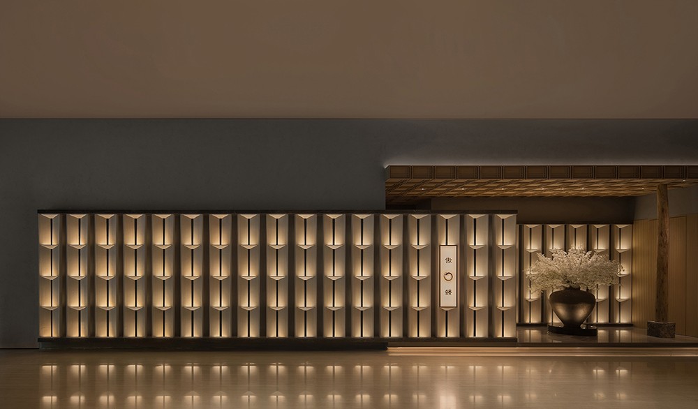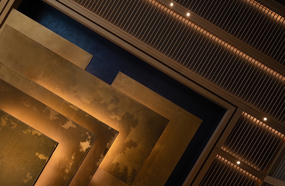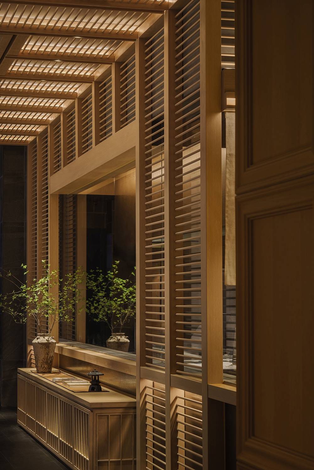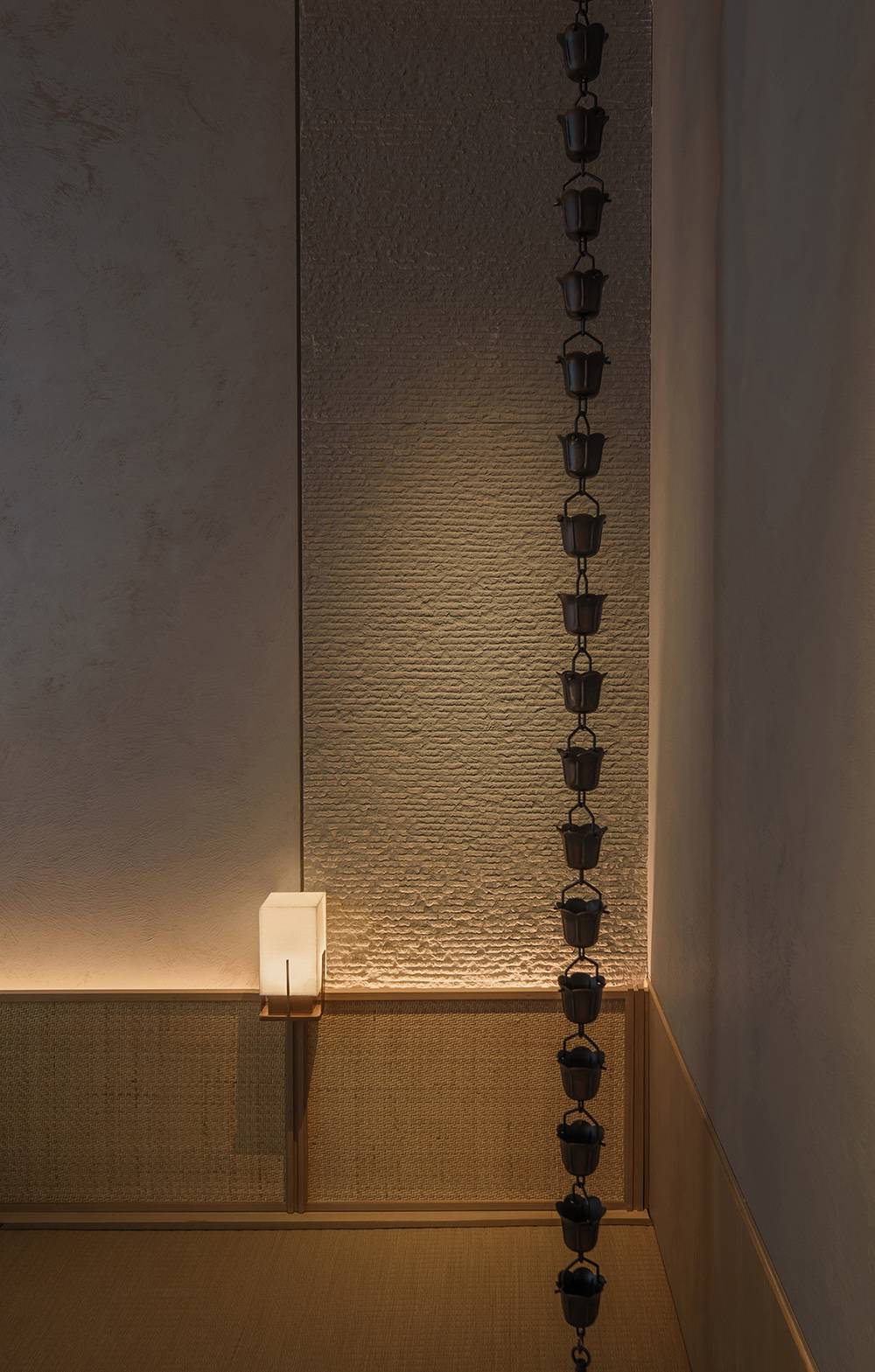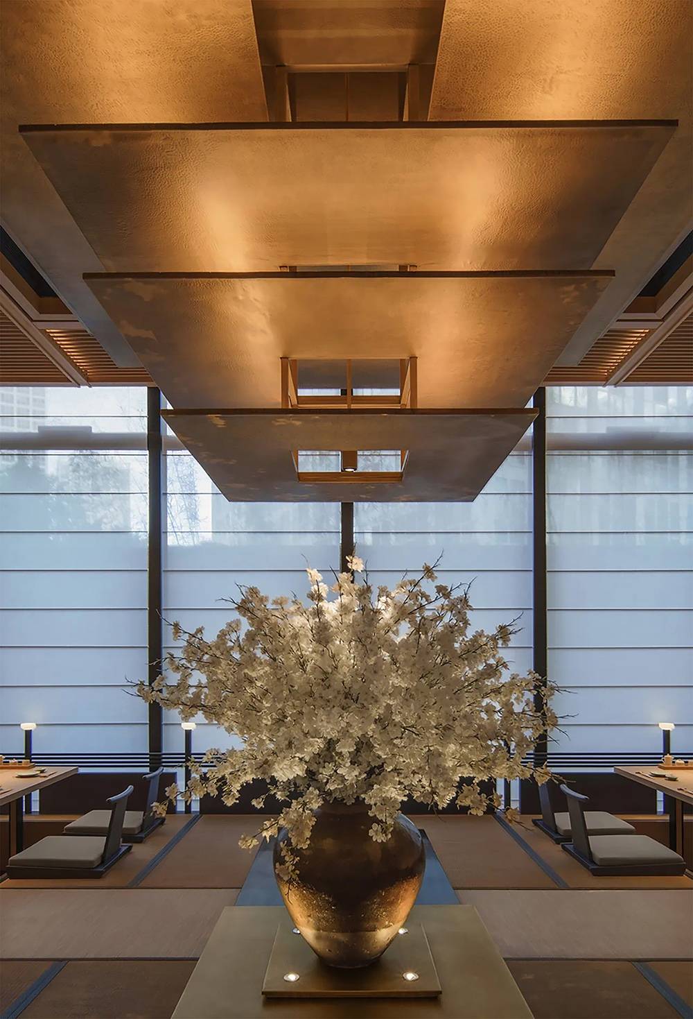 食客穿行至开阔的大堂之处,从天花上悬挂下来的金色装置映入眼帘,仿佛如初见水中倒映的金阁寺一般。装置来自京都传统的锻金工艺精心制作而成,自然的纹理赋予了其古朴的质地,又非一味的文化符号挪用,仅以简约的线条抽象描摹,强调出现代性的轮廓感,寥寥数笔就将这静谧与遁世离俗的气质渲染,仿佛有来自原野的风、摇曳的枝叶和湿润苔藓的气息都刹那间涌了进来。
