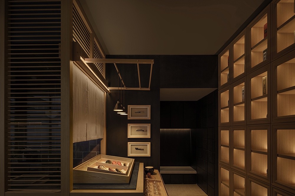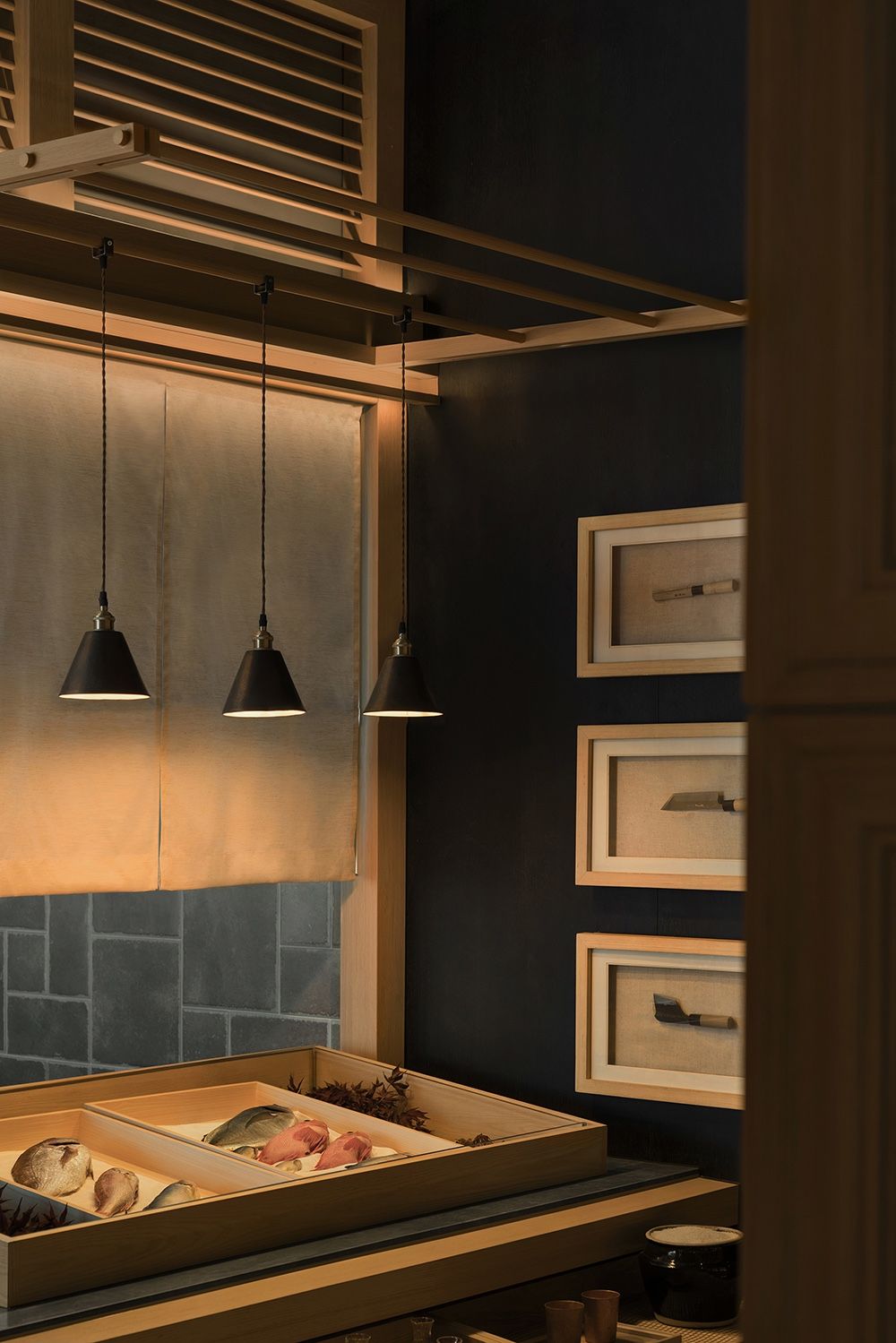而在与大堂平行并置的另一端明厨空间内,可近距离欣赏厨师炙烤鳗鱼和端炉烧的烹饪过程,与大堂空间中悬挂的艺术装置形成了有趣的互文关系——匠人们以火为主要方式淬炼出顶级料理的口感,与浴火再生的金阁寺复现之美,此时此地,发生碰撞,对话,并盘旋上升,最终得以在整个空间回荡。