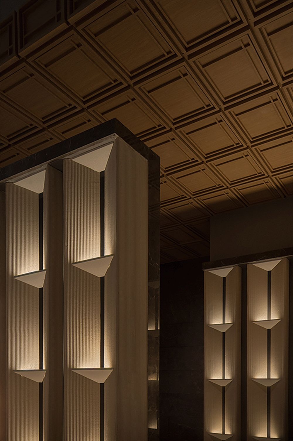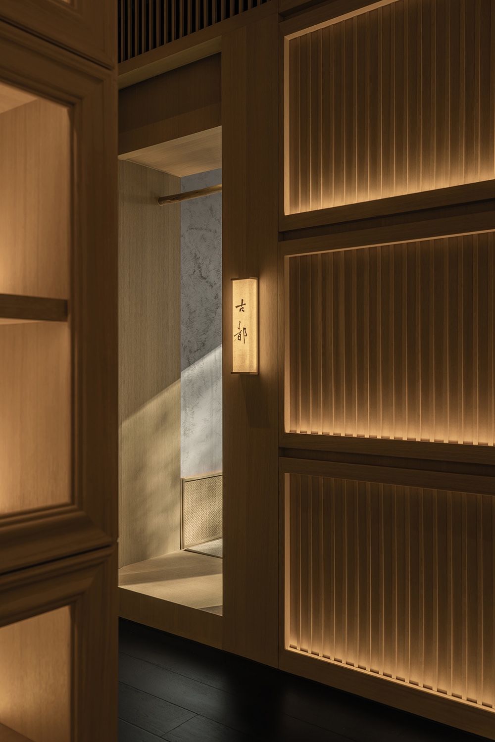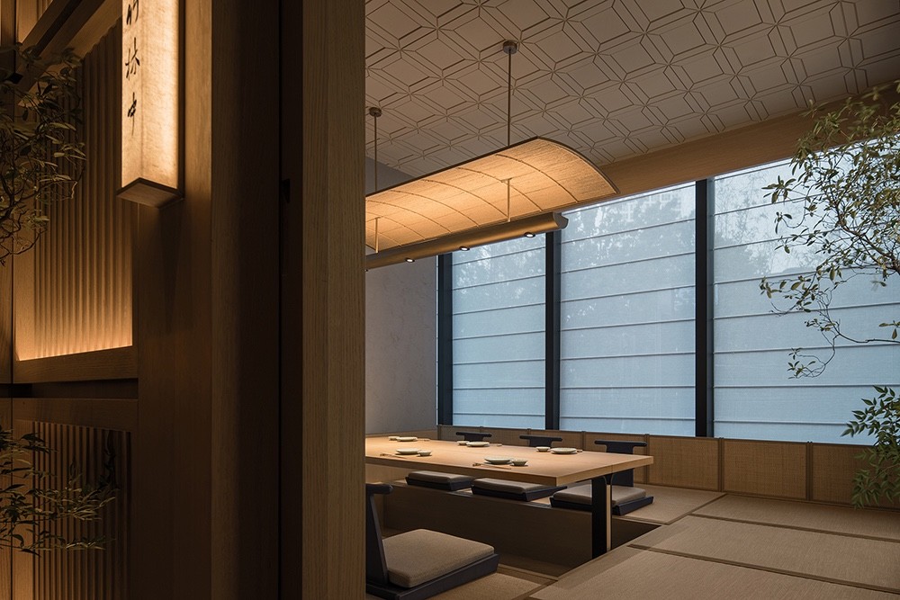 空间中还有很多与“纸”相关的元素让立面有了生机和呼吸感。大厅中设计师基于对传统和风纹饰的吸收而原创的壁纸也恰到好处的为整体氛围铺陈。包厢中透光的杜邦纸搭配前方的植物,更有如山本梅逸的纯墨色卷轴画一般的风骨。一窗之隔的室外是车水马龙,室内幽篁疏影,在方寸之间就能有了自然转换的远近空间与细腻有致的层次布局。