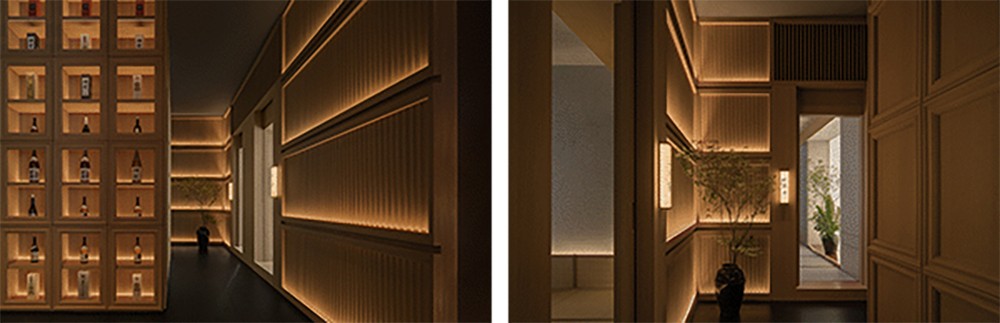 整个空间以京都阡陌交错的街巷格局为空间参照范本,整体以交通空间为串联起或开放或私密的用餐场景,也让空间有了张弛的节奏,时而是轻快,时而舒展。走道的宽度被精细的控制到恰好适宜一人自由穿行,二人并肩拥挤的尺度之内,致敬暧昧模糊的“幽玄”之美。