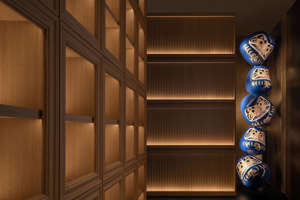 点缀在空间中的雕塑是设计师克制之外流露闪烁的意趣的体现——五只叠放的达摩不倒翁成为走道尽头的端景,达摩作为日本最为受欢迎的吉祥物形象,憨态可掬,如同酒醉后颠倒的不规整形态,打破了走道平淡与严肃的框架,如同吹拂而过的清风为空间带来了一丝放松。