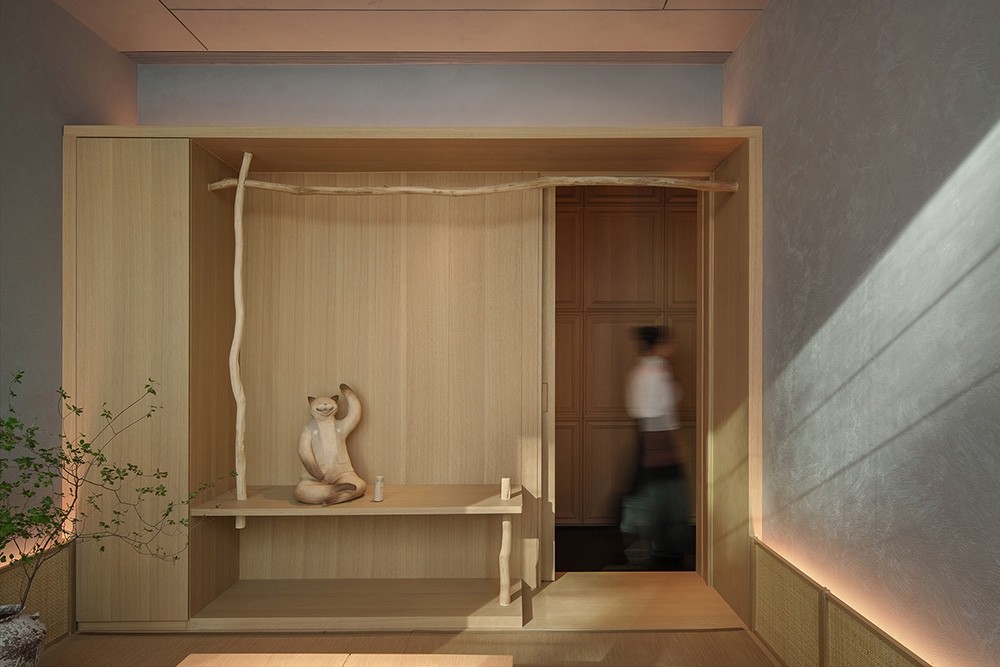 在空间装饰上,设计师没有直接对日式传统民居建筑语言进行的1:1转述复刻,而是尝试化繁为简,以更为现代的设计语言传递传统日式美学精神。阵列式的门头和内部垂直向的木格栅都是如此。