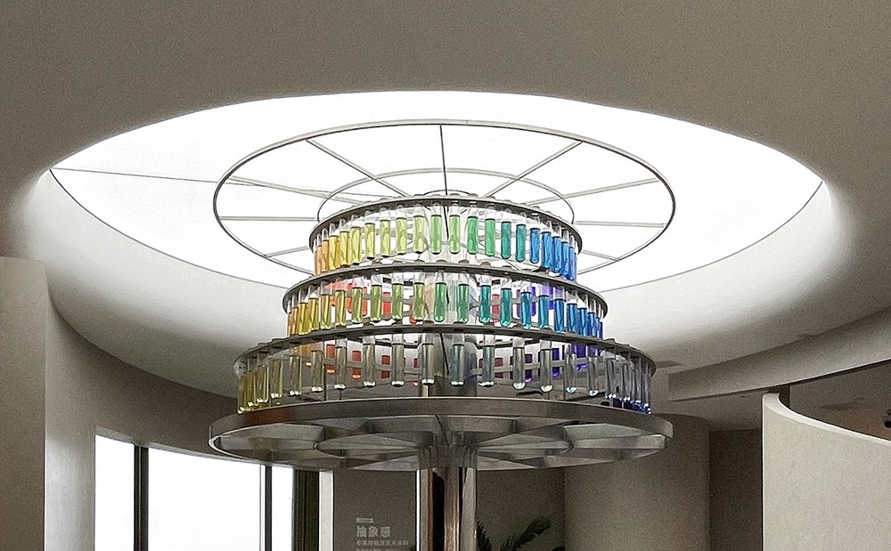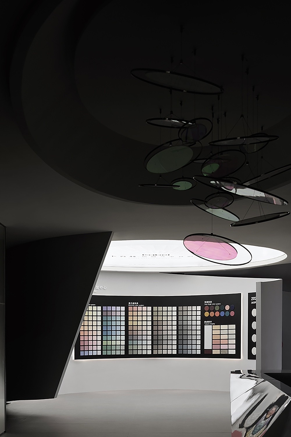 在展厅的大堂领域,一组绚丽的圆形彩色亚克力灯片宛如星辰点缀。灯光如诗,穿越彩色的亚克力灯片,轻轻抚摸过墙面和地面,把空间幻化成梦幻的彩色宇宙。这一巧妙的设计,如同旋律绕梁,不仅在视觉上演奏出动人的音符,更赋予了展厅独特的灵魂和气质,进一步诗化了涂料展品的主旋律和特色。