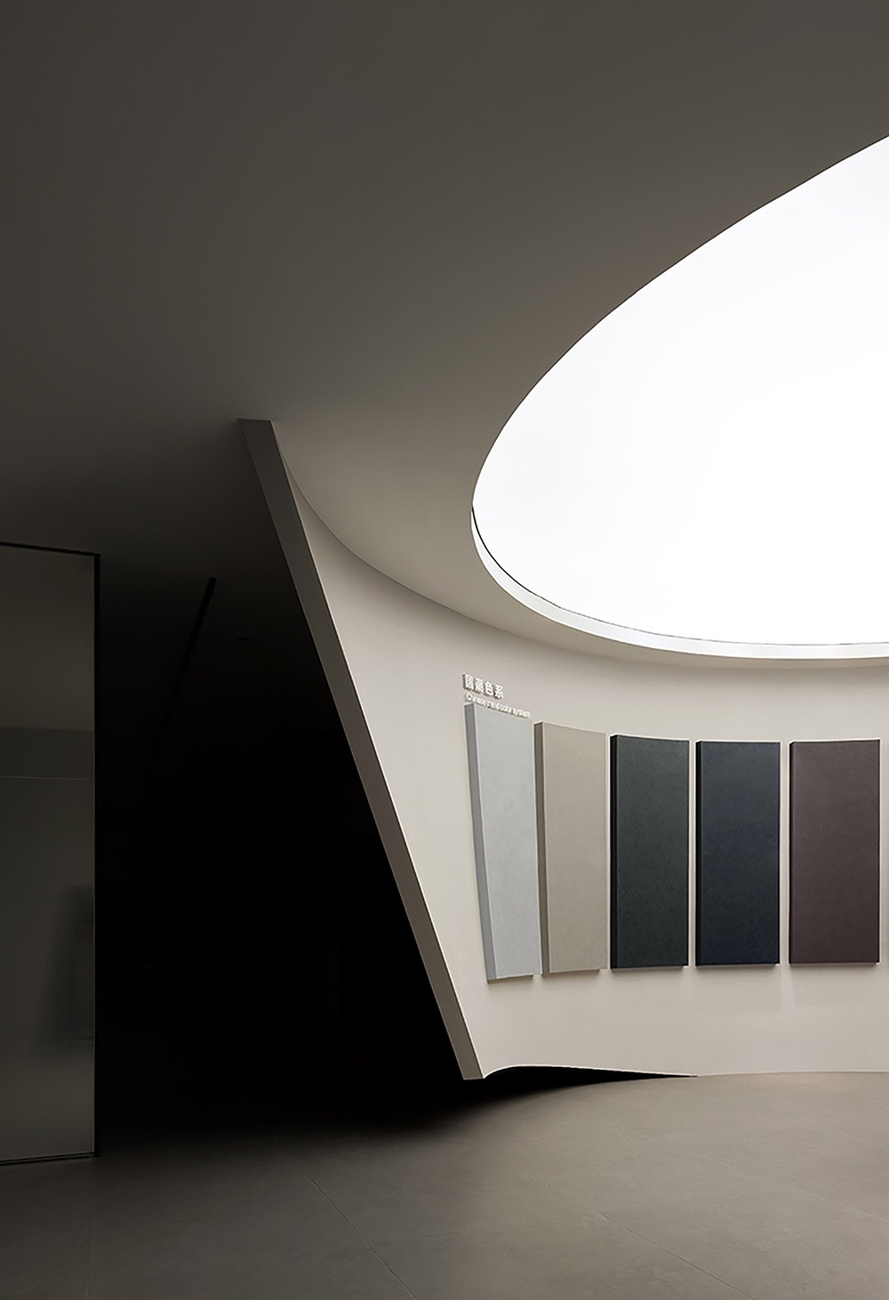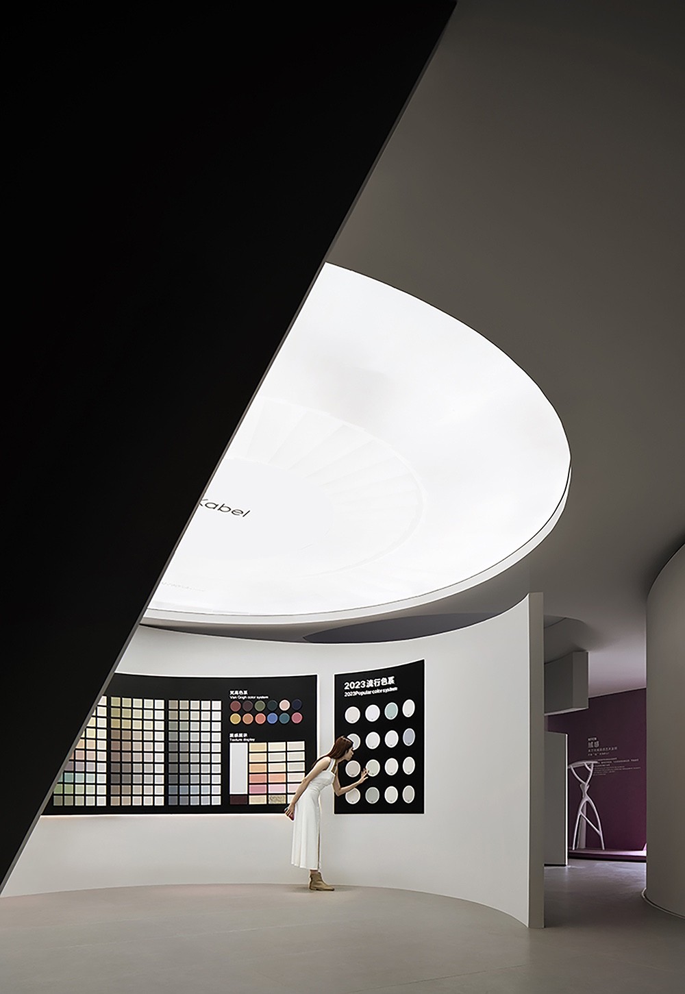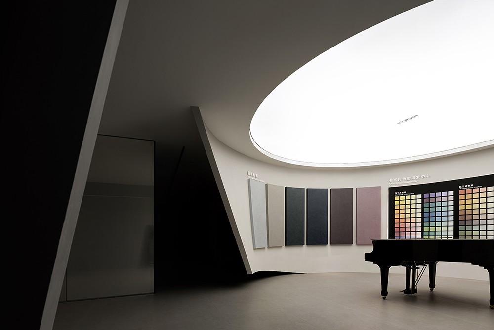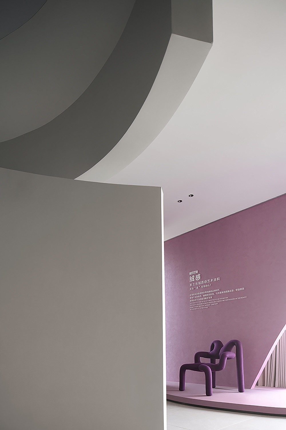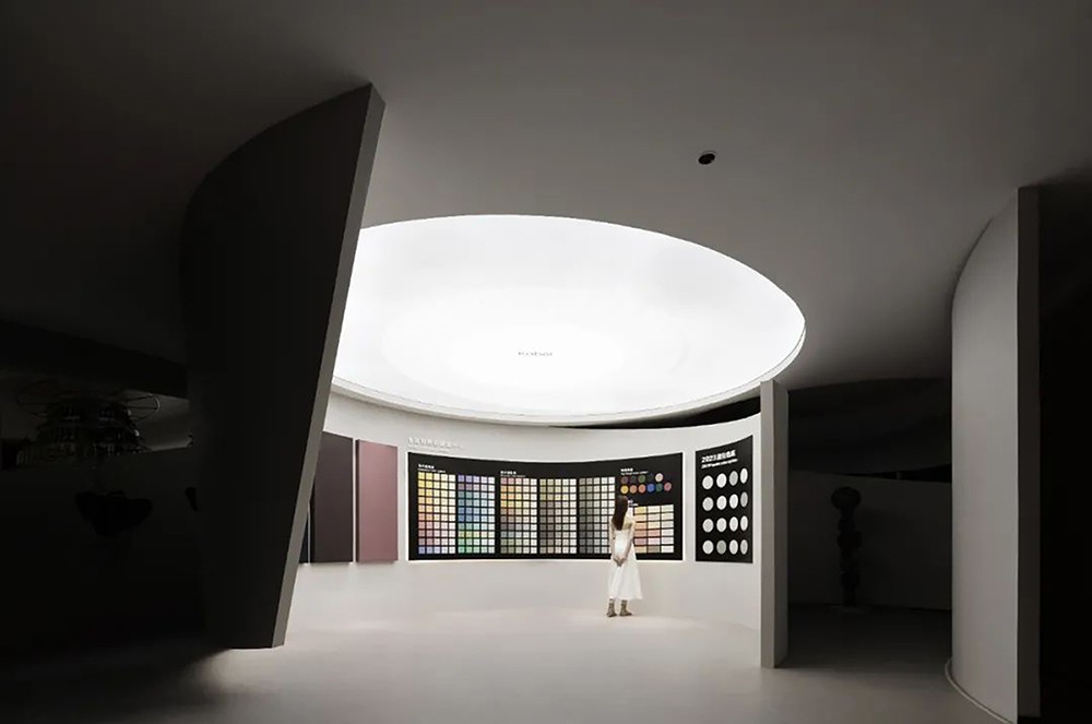 在这个展厅中,空间是舞台,色彩是主角,光投射在空间每一个角落。曲面墙体犹如艺术家的笔触,在空中挥洒出了绚丽多彩的轨迹,让人沉浸其中,与艺术对话。每个空间都展示了不同的艺术涂料纹理,呈现出产品的多样性质感。