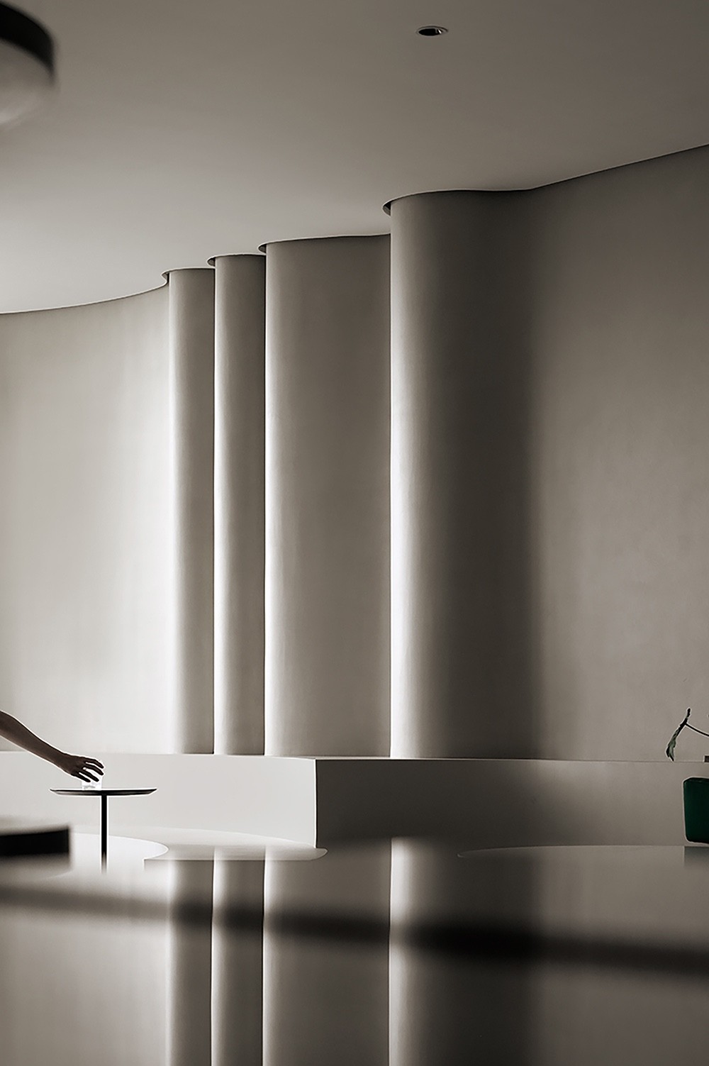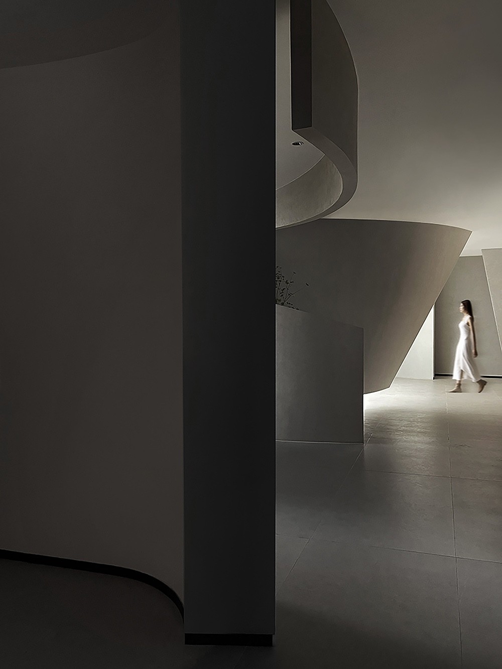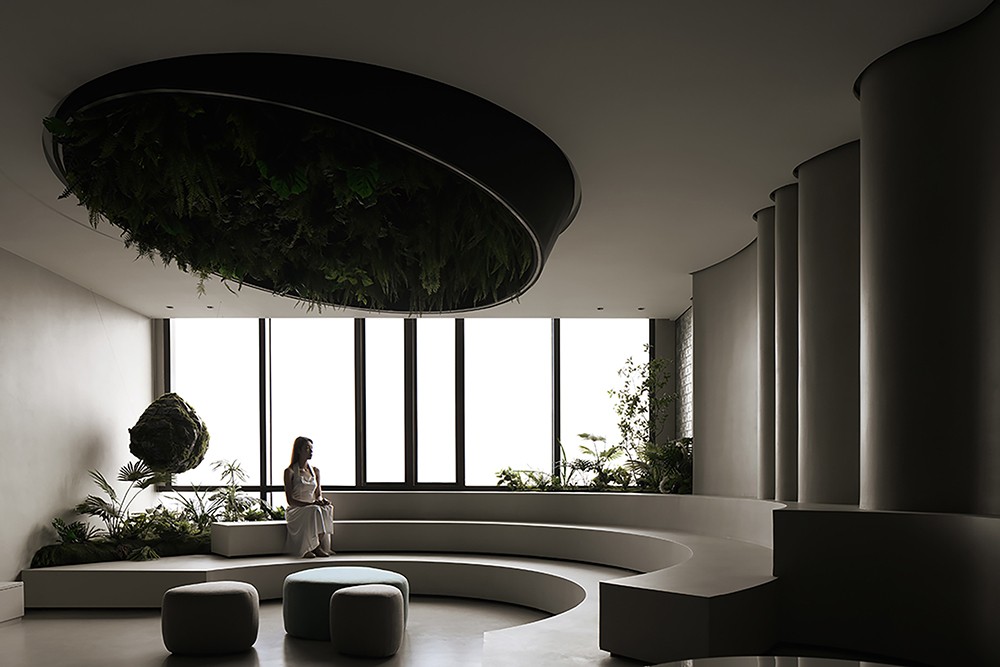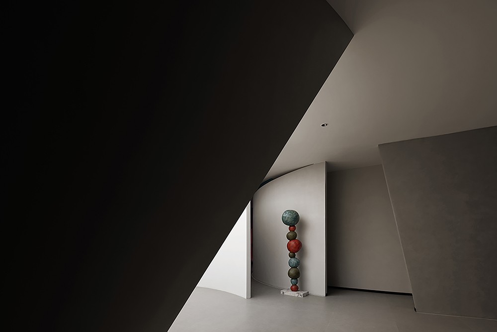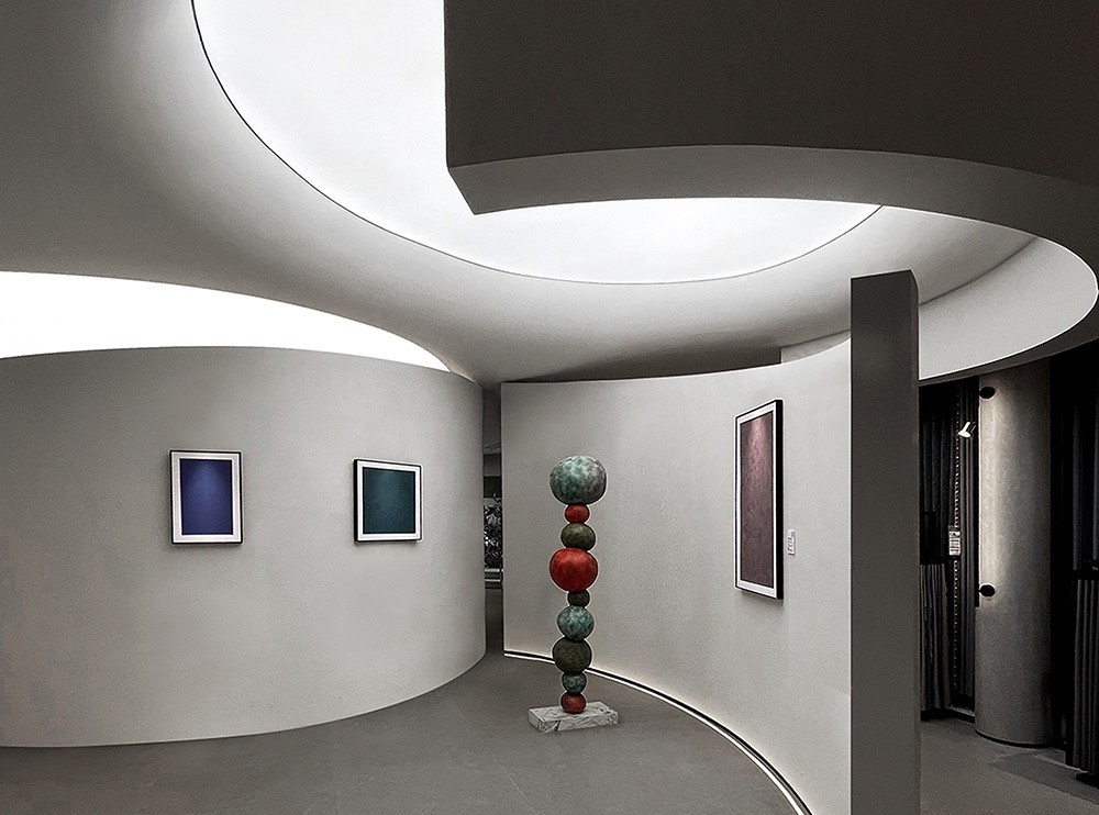 纵横穿插的墙面和圆形天花由卡百利微水泥、微晶水泥、米兰丝绒、布莱娅等艺术涂料装点而成,它们以流动的姿态,展现时间与空间的交织,犹如进入了一个超现实的当代艺术画廊。