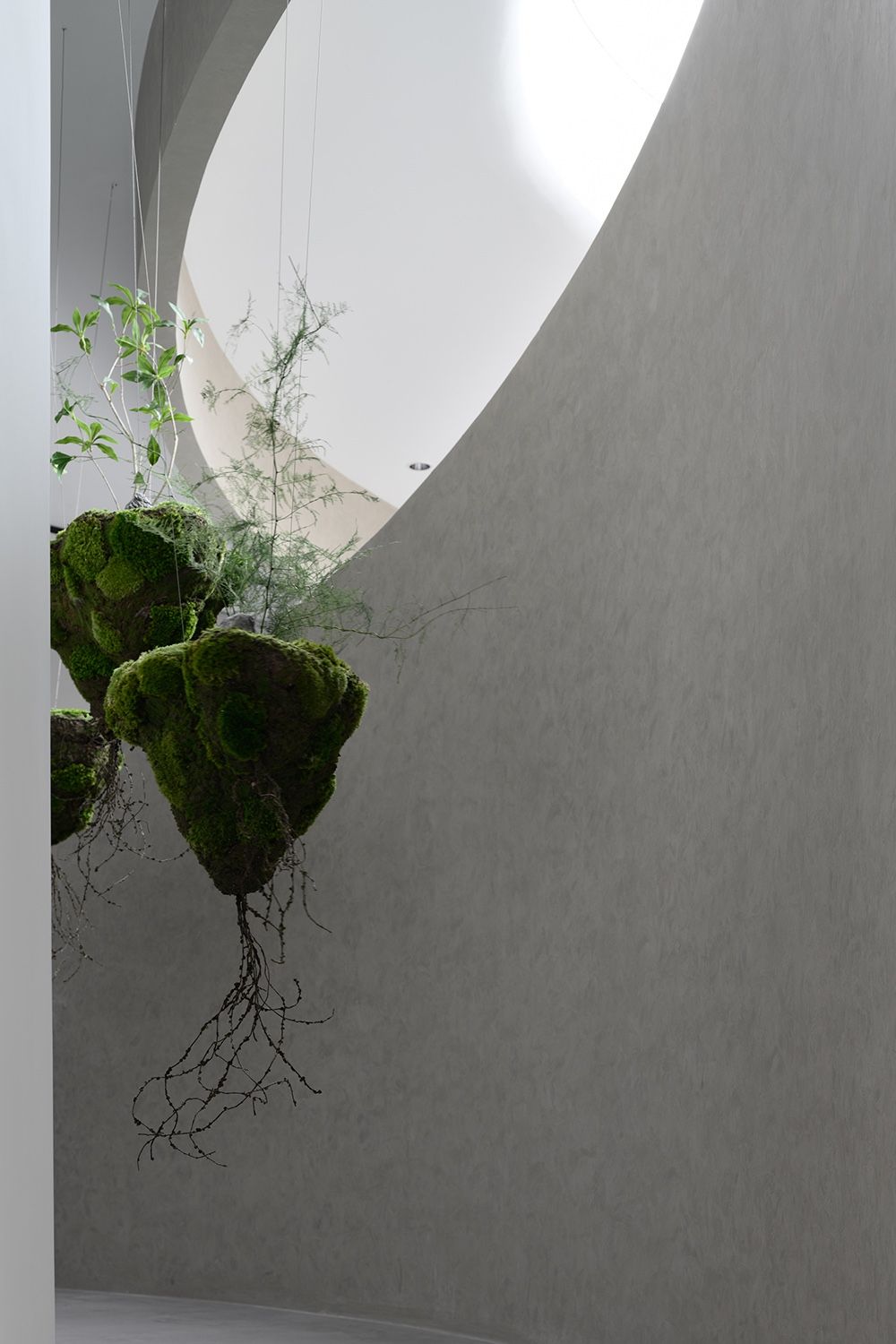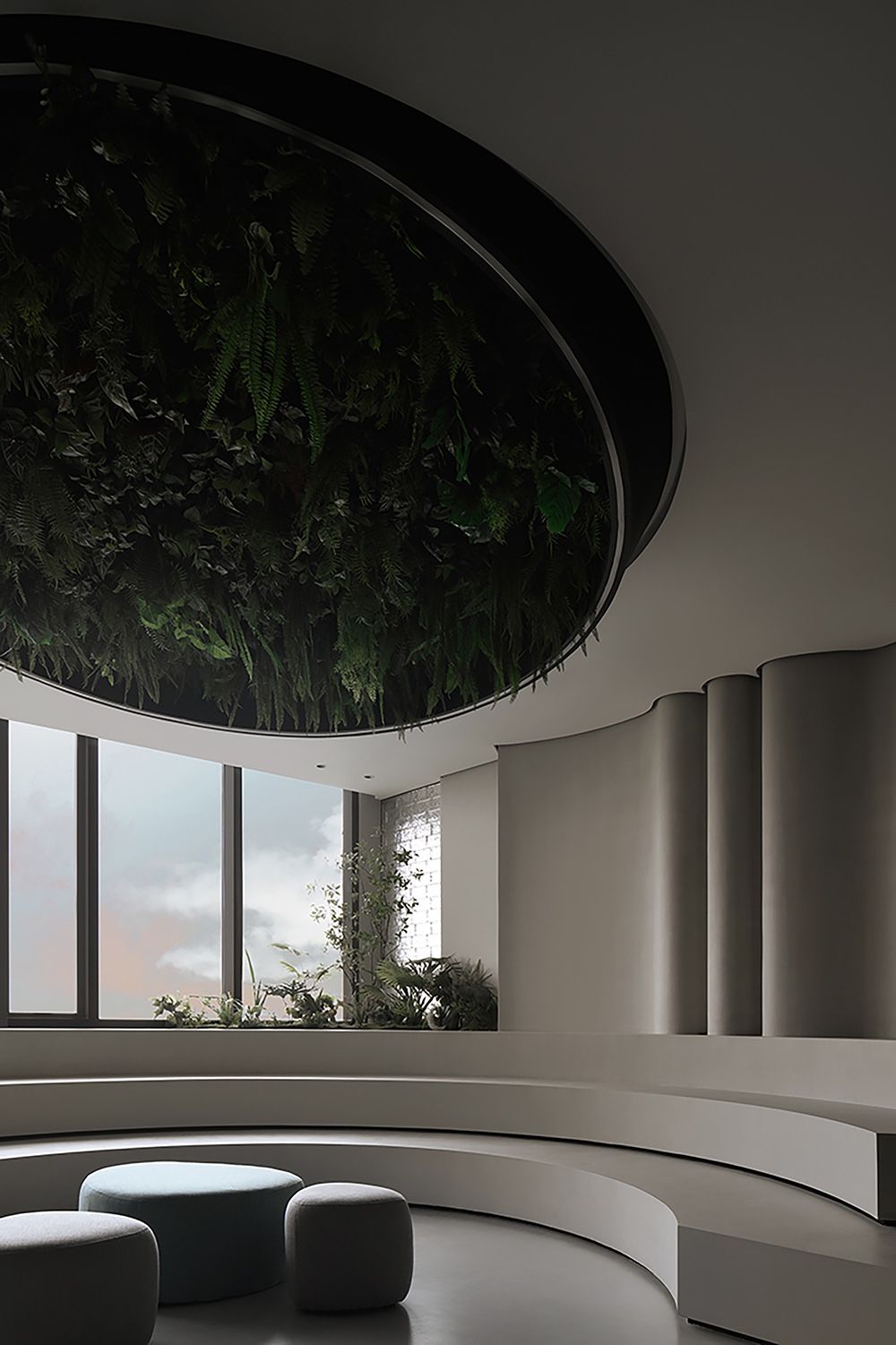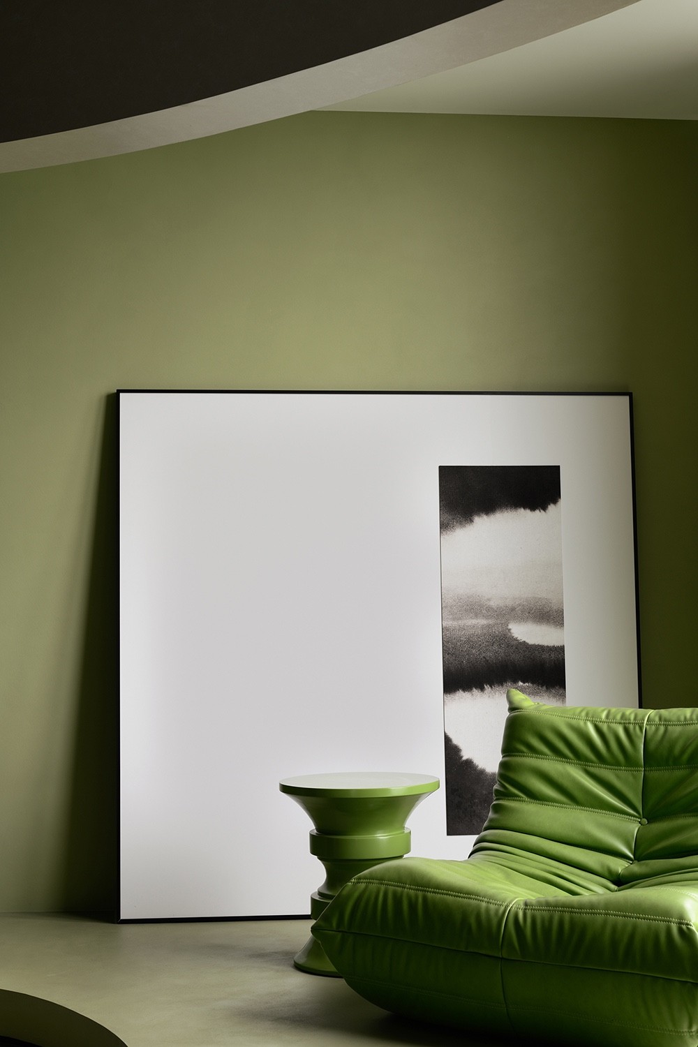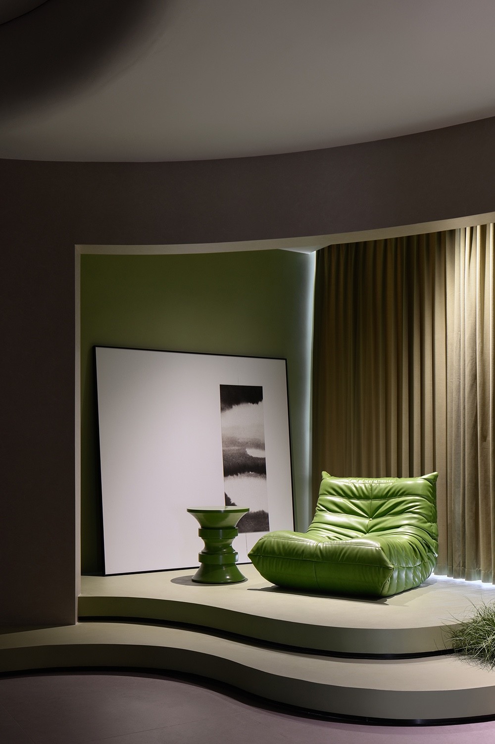 纵横穿插的墙面和圆形天花由卡百利微水泥、微晶水泥、米兰丝绒、布莱娅等艺术涂料装点而成,它们以流动的姿态,展现时间与空间的交织,犹如进入了一个超现实的当代艺术画廊。