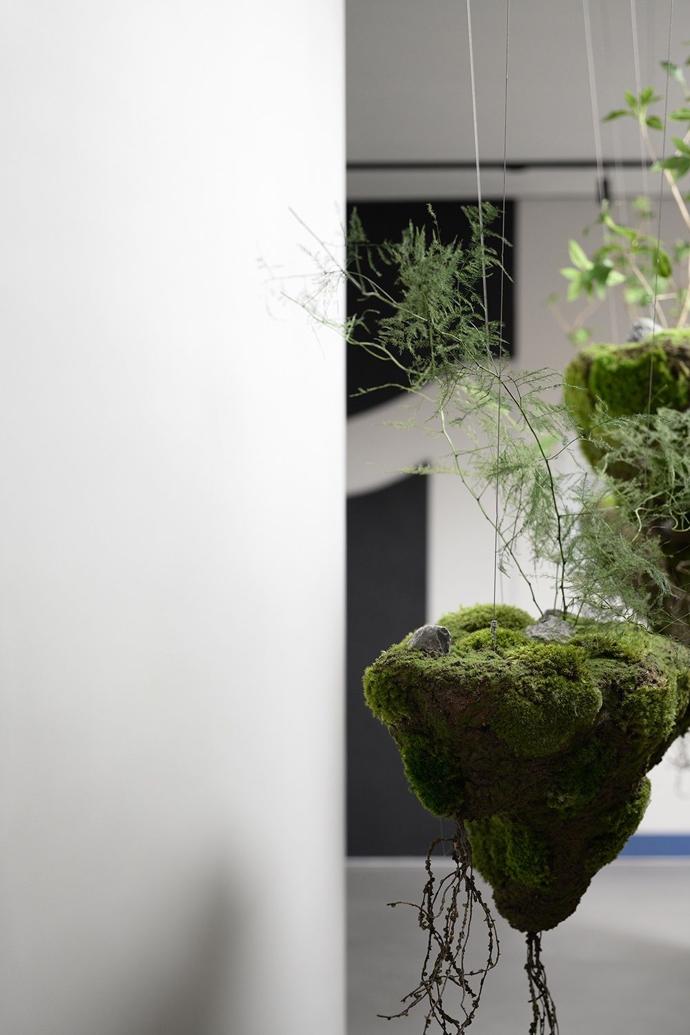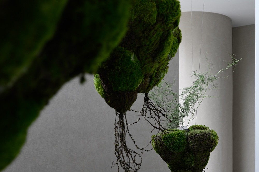 进入水吧区,映入眼帘是一片上下颠倒的光之丛林艺术装置,就如同一幅诗意的画卷呈现在眼前。日光从一旁的玻璃砖墙透出,绿色、黑色和白色交织在一起,仿佛在光影中跳跃,构成了一片诗意的自然之境。