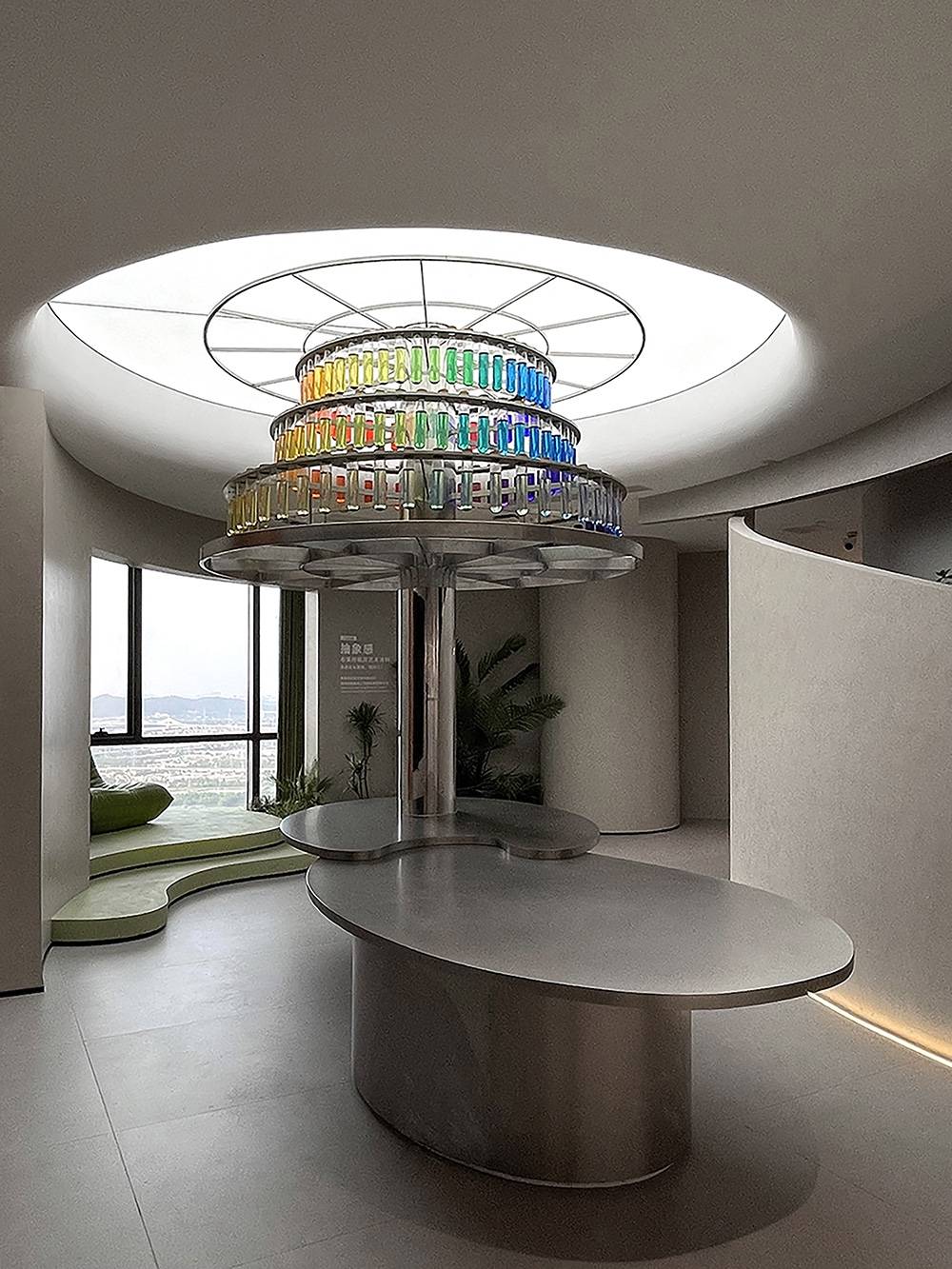 这个空间创意将艺术、自然和科技巧妙地融合在一起。调色板桌子、玻璃试管容器和树形架子共同构成了一个引人入胜的视觉景观。它以富有创意和象征意义的方式展现了产品的色彩丰富性和灵感源自大自然的概念。观者在这个空间中能够感受到色彩的活力和大自然的美妙,同时也对品牌的创意和创造力产生共鸣。