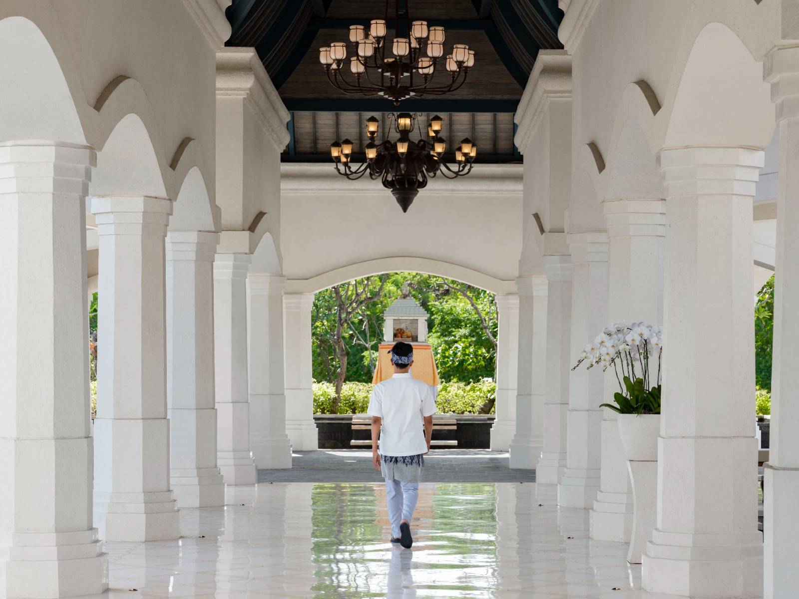 宾客抵达时穿过宏伟的巴厘岛式大门,两侧镇守着名为Singa Ambara Raja的石兽。在充满象征意义的本地文化中,大门是连接现实世界与灵界的重要门户。头顶上,两只*满者伯夷文化中的神兽展翅飞翔,保卫着通道。(*注:满者伯夷是十三世纪末建立于爪哇岛东部的封建王朝,也是爪哇岛上最后一个印度教王国。)