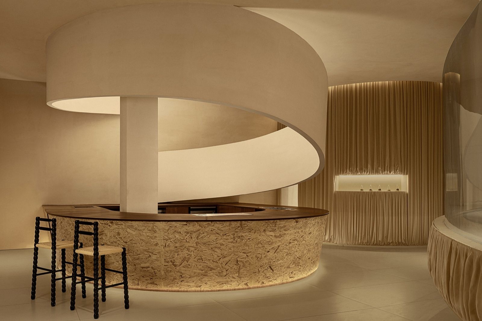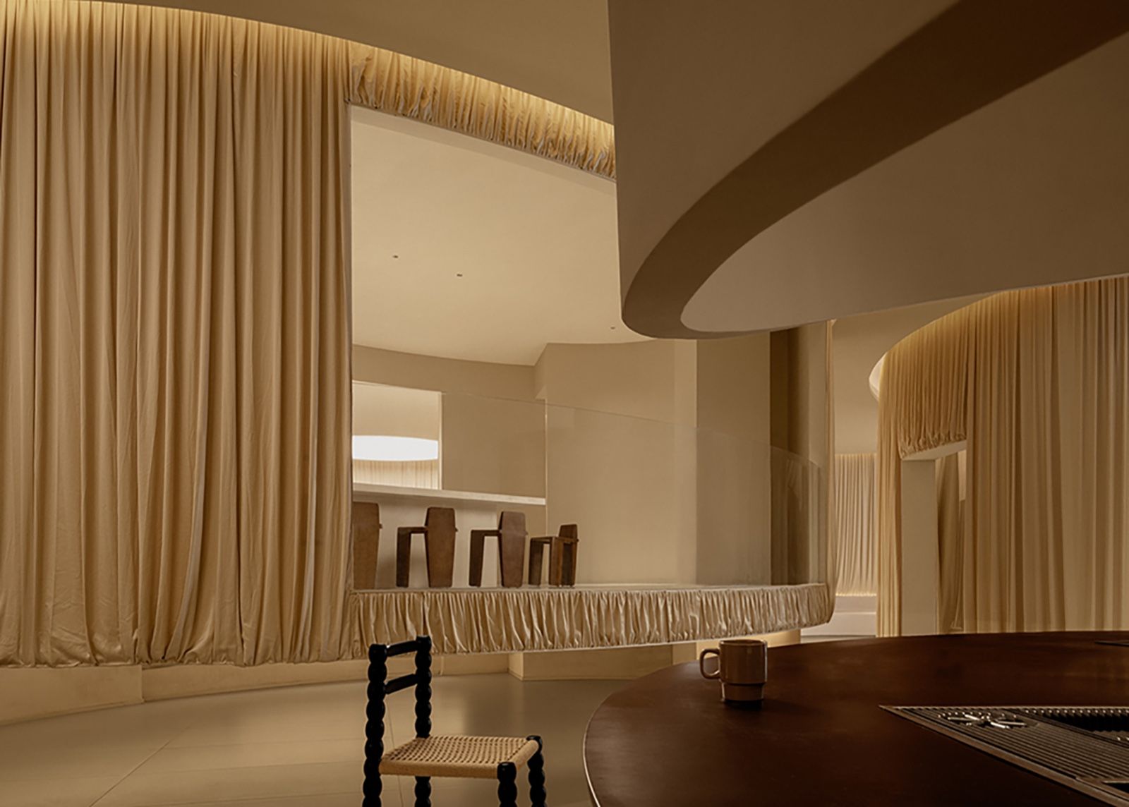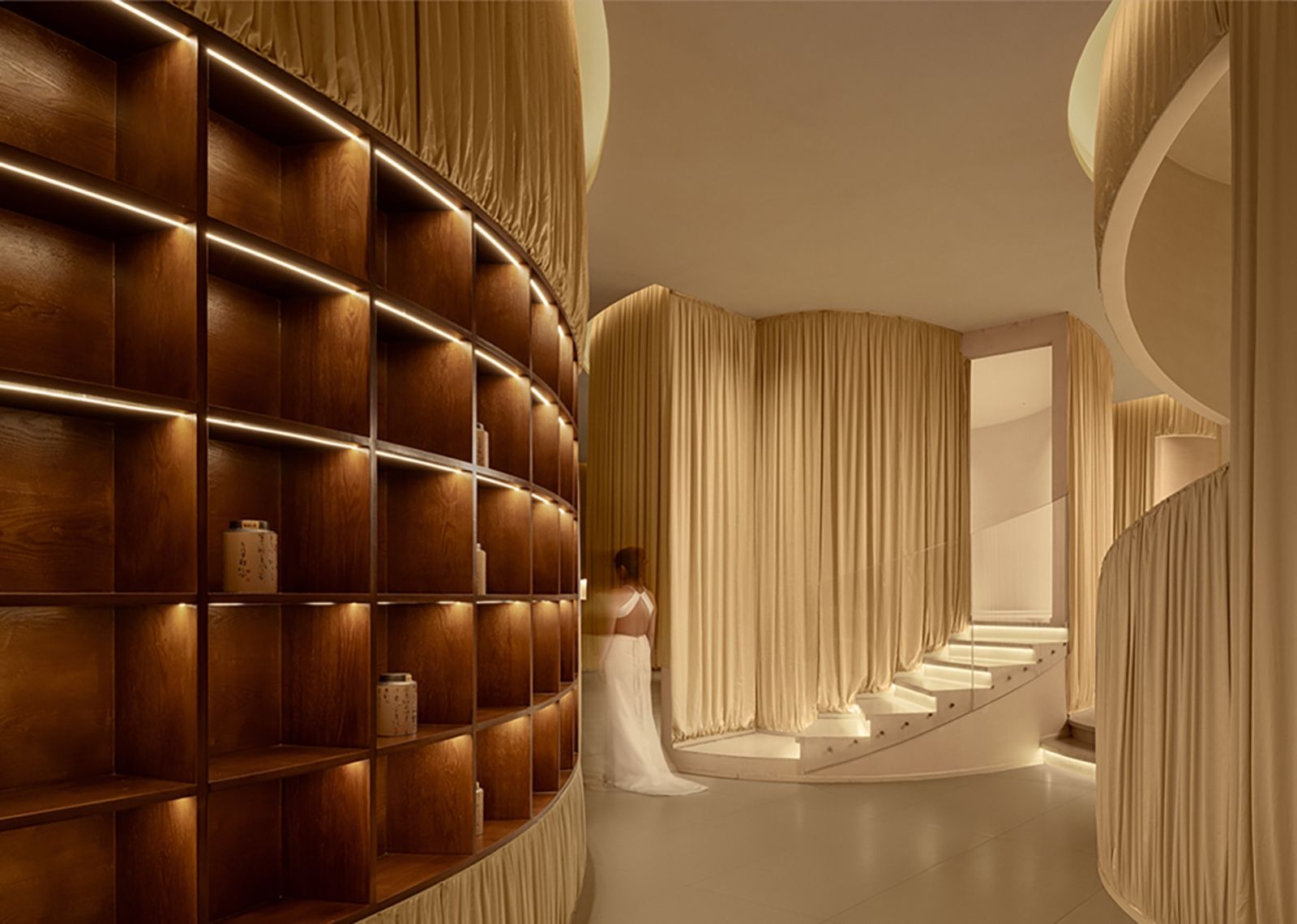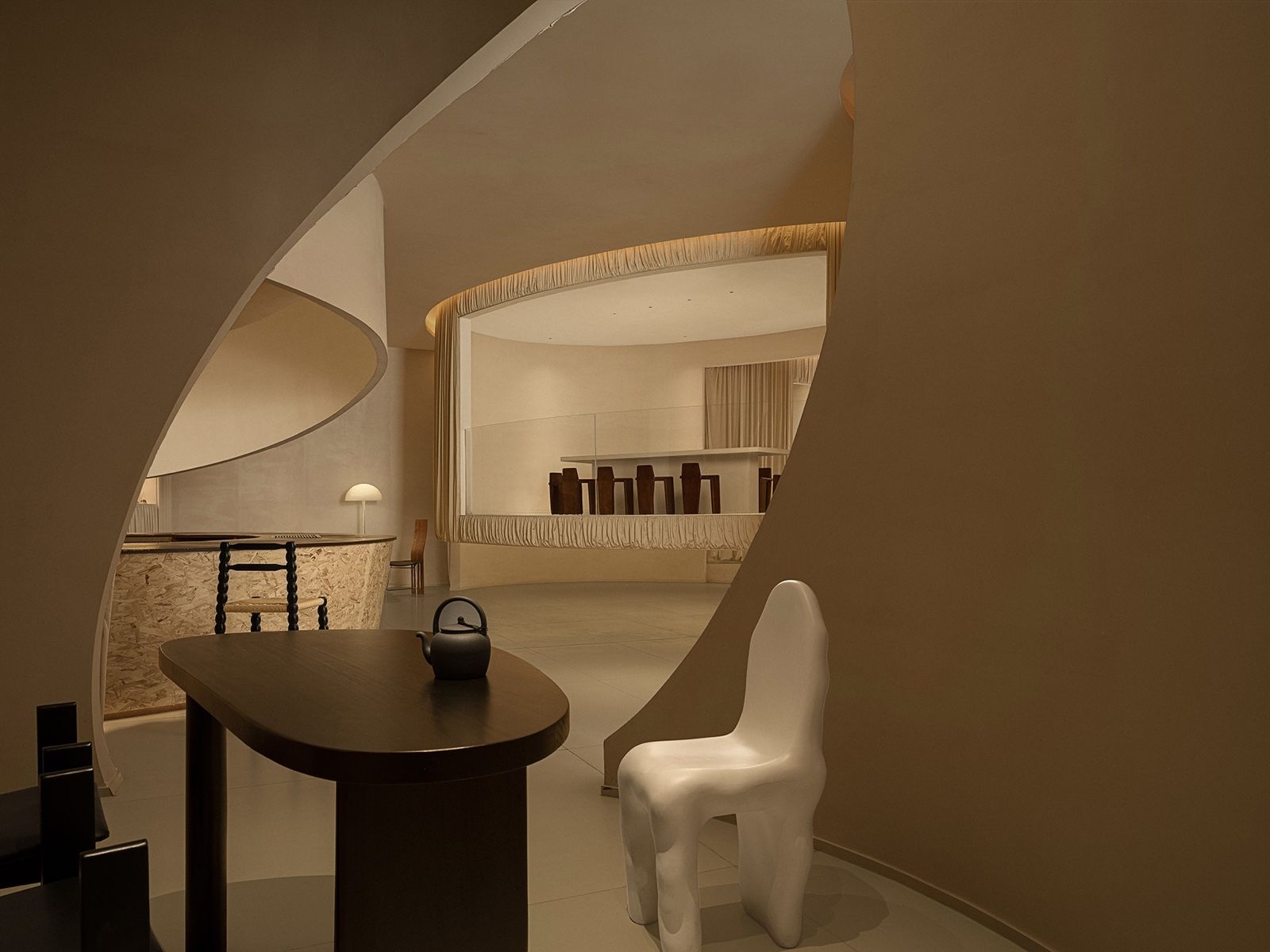 大面积温暖的色调铺成,是统一整个空间的情绪色彩,从纯白,乳白,米白到深棕,色彩由浅入深,心境也随色彩的情绪流动,或静谧,或悠然,或沉思。思绪在每个“圆圈”中缓慢漂游,沿着轻薄的纱幔落下,顺着弧线的边缘停留。袅袅茶香,攀着深浅的颜色变化,爬上心头。设计师用“情绪”的色彩完成了对心境的捕捉和阐述。