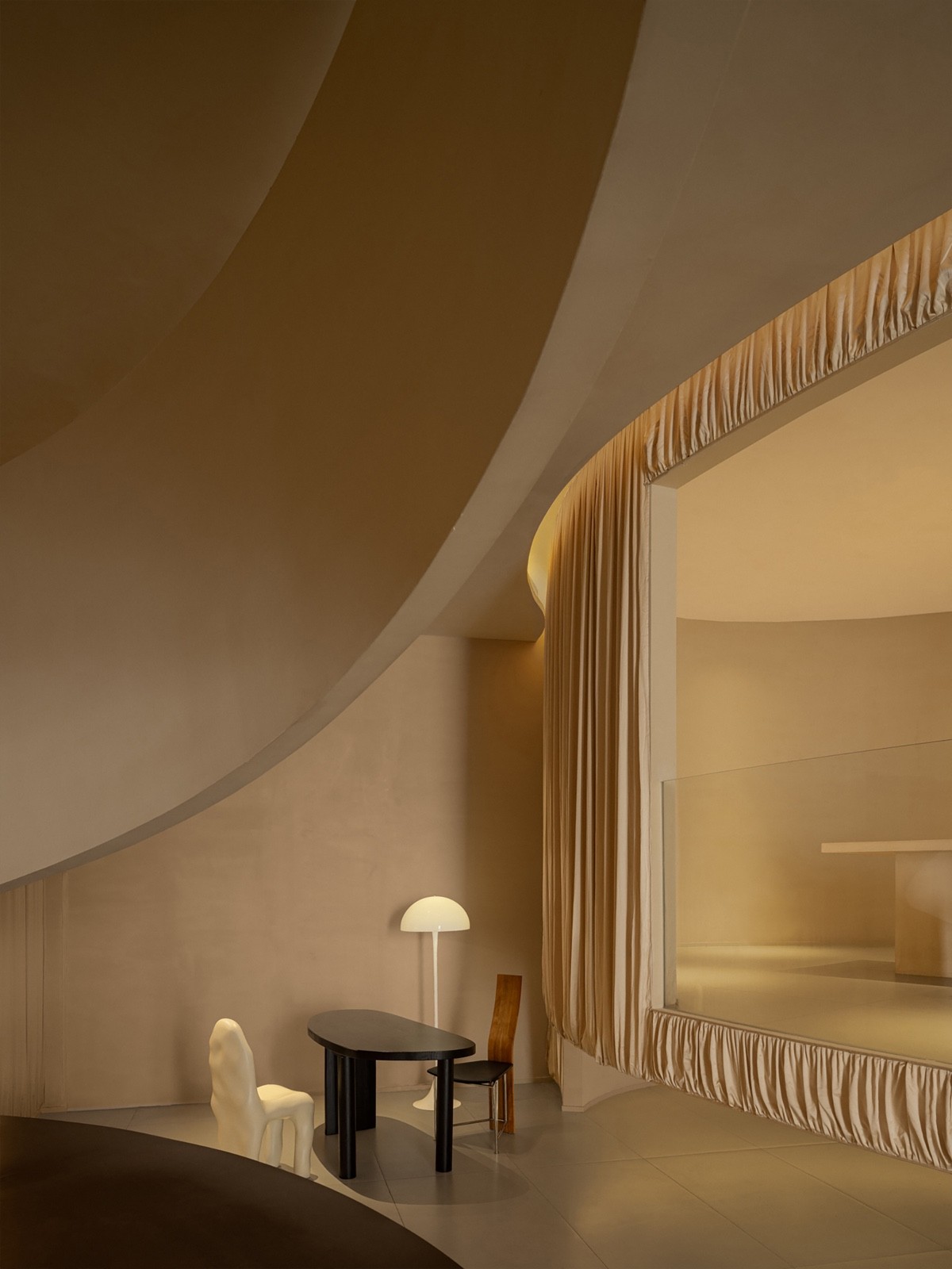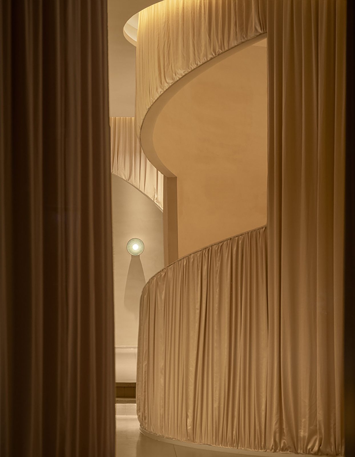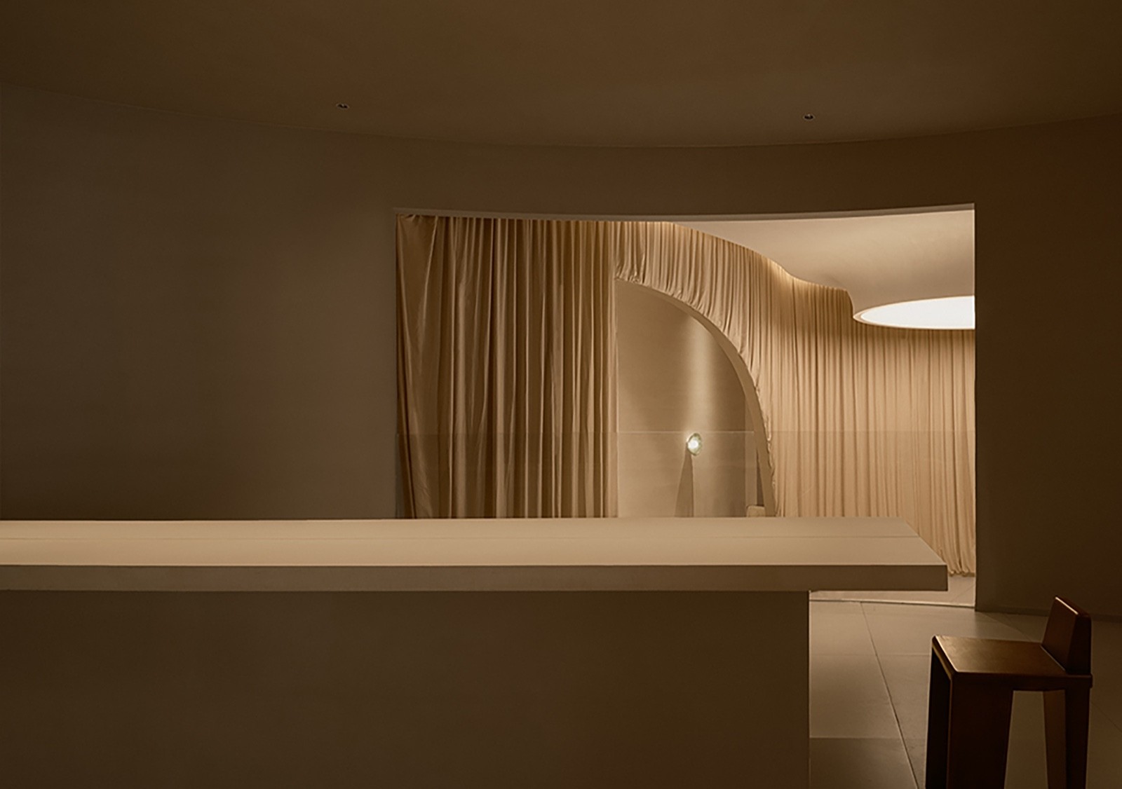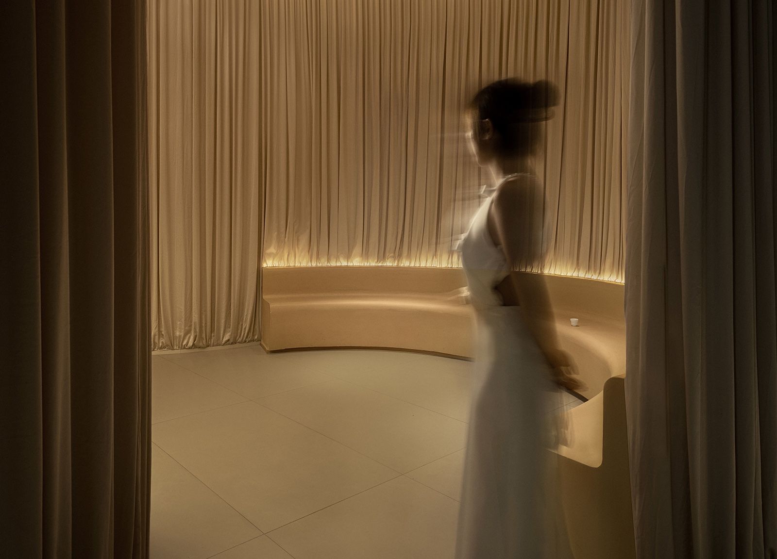 在整个茶空间中,设计师挑选了“布幔”作为整个设计的主角,用轻柔的布幔围裹住坚实的建筑,使整个空间更加柔和,舒展。“布”作为空间的传达介质,以其柔软的特质和形态触达内心的私密领地,当人们面对散落的情绪,便需要一隅安静来投射灵魂与自我,让到访者放下外界的喧哗,在柔和、静谧的空间中体味热爱与悠然,这也是设计师的初衷。