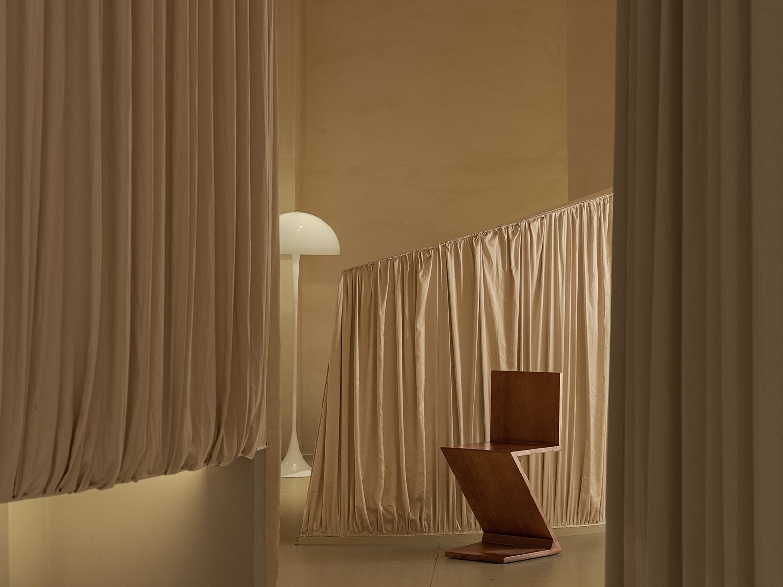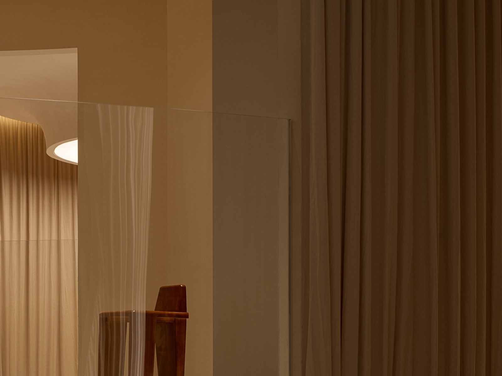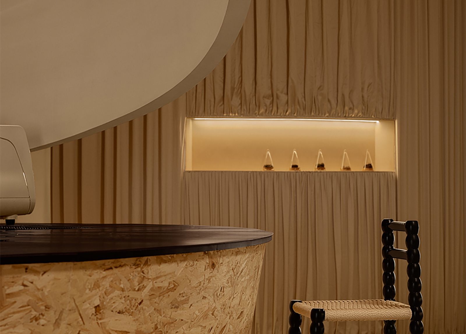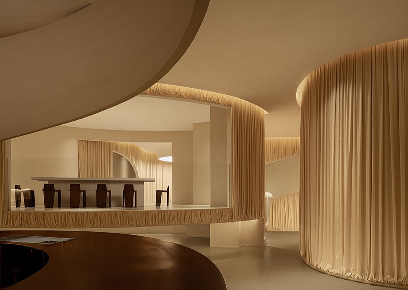 在整个茶空间中,设计师挑选了“布幔”作为整个设计的主角,用轻柔的布幔围裹住坚实的建筑,使整个空间更加柔和,舒展。“布”作为空间的传达介质,以其柔软的特质和形态触达内心的私密领地,当人们面对散落的情绪,便需要一隅安静来投射灵魂与自我,让到访者放下外界的喧哗,在柔和、静谧的空间中体味热爱与悠然,这也是设计师的初衷。