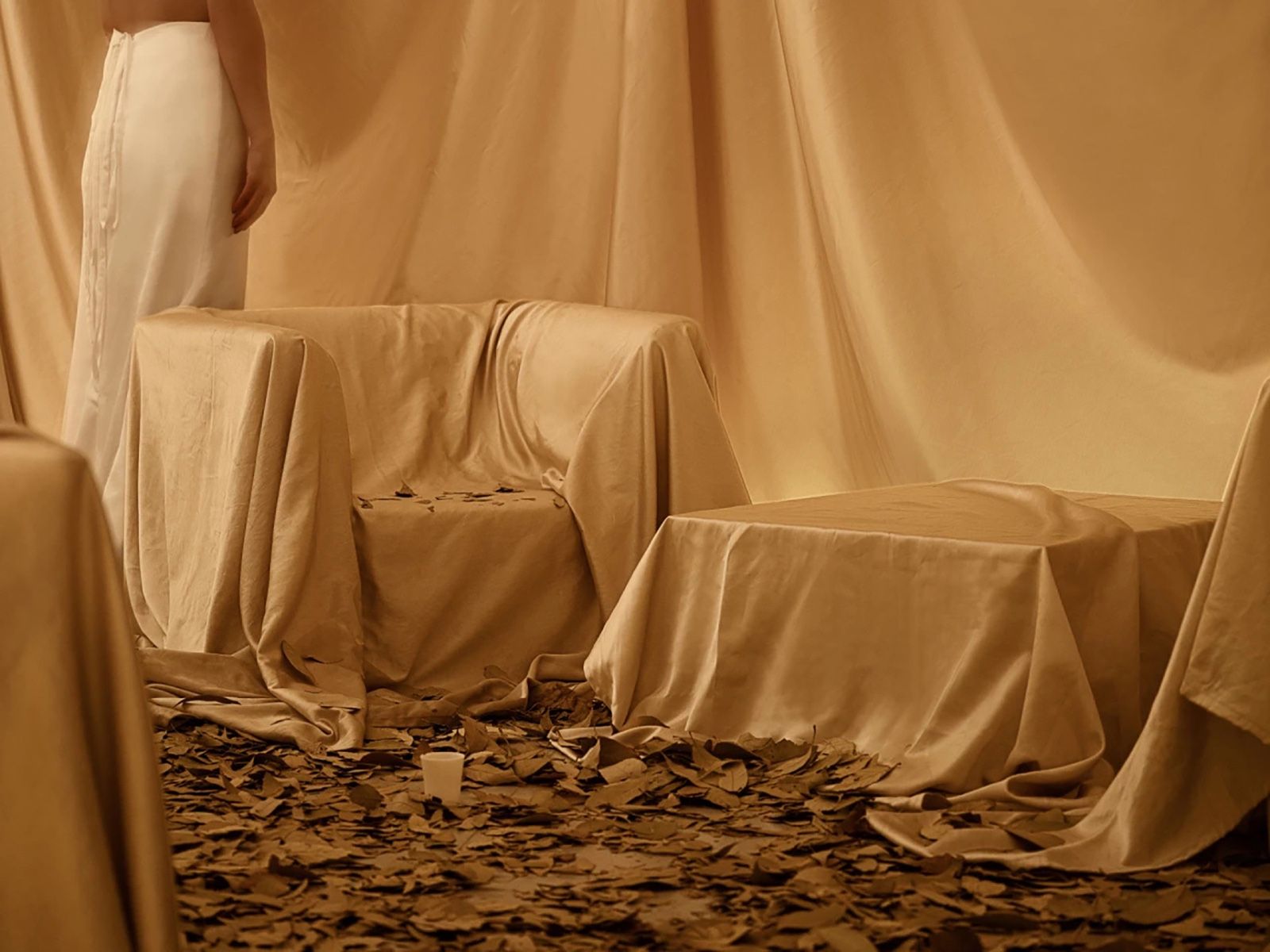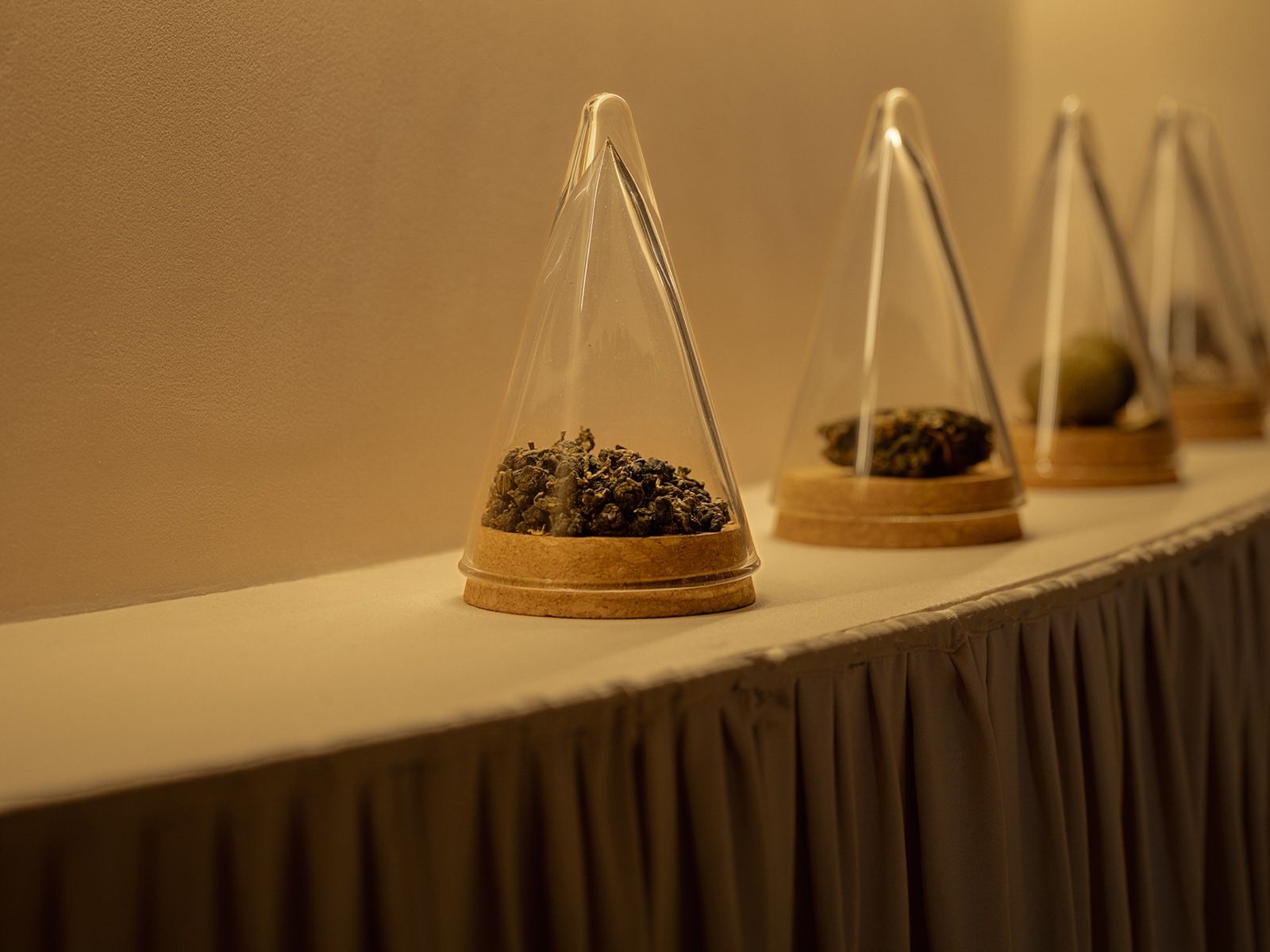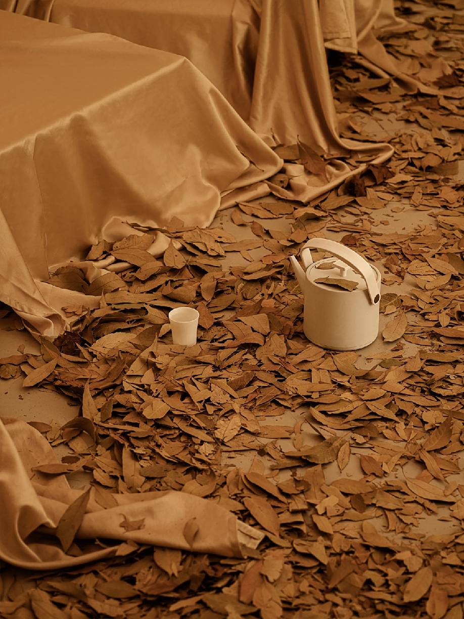 散落一地的落叶,缓缓将你带入某一片历史拾遗处,踩着落叶的那一阵窸窸窣窣,仿佛历史的耳语。展示区将不同的意向形态化呈现,由白色的帘幔包裹住内心的悸动,播下一颗“情绪”的种子,让他在茶香中发芽、长大。翻过历史的篱墙,这里的将风雅、宁静凝结成空间记忆,帘幔与木质壁龛,硬软相接,整个空间在虚实的张力中达到平衡的美感。