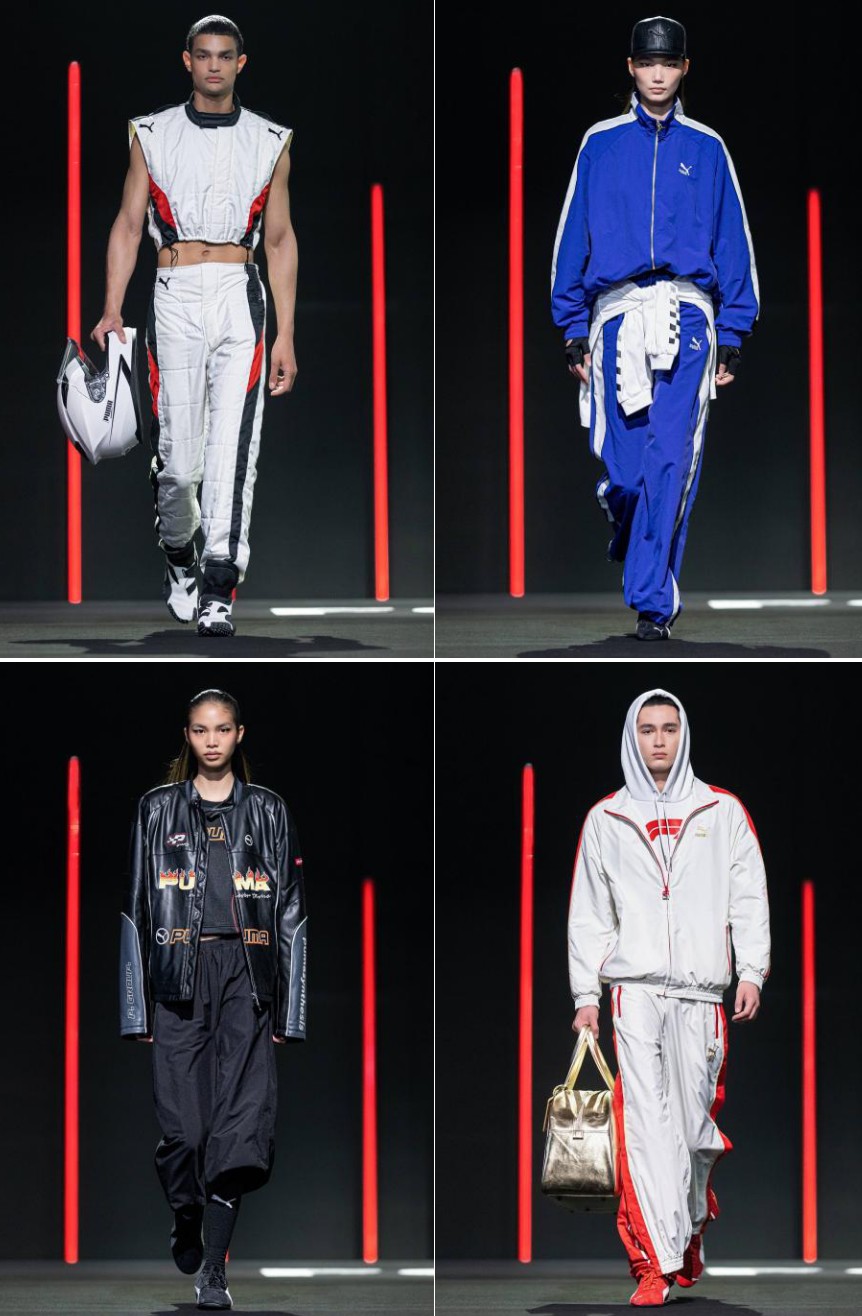 本次PUMA Runway大秀展示的造型以品牌经典系列与设计师定制系列构成,全面展现PUMA深厚品牌积淀之上的创新实力。由赛车运动灵感启迪的系列产品,包括极具未来感的“先锋怪物”Mostro、复古基调的传奇鞋款Speedcat,传递出PUMA沉淀多年的独特“赛车美学”,以及打破潮流边界的“FASTER”超越精神。标志性的T7运动套装等复古系列产品,在保留运动套装应有的经典廓形设计上持续突破。无论是大胆而富有张力的色彩运用、融汇多元风格的单品混搭还是前卫独到的剪裁工艺,所蕴藏的细节巧思都体现出PUMA对极致的不懈探求,一展“FOREVER”的经典新生。