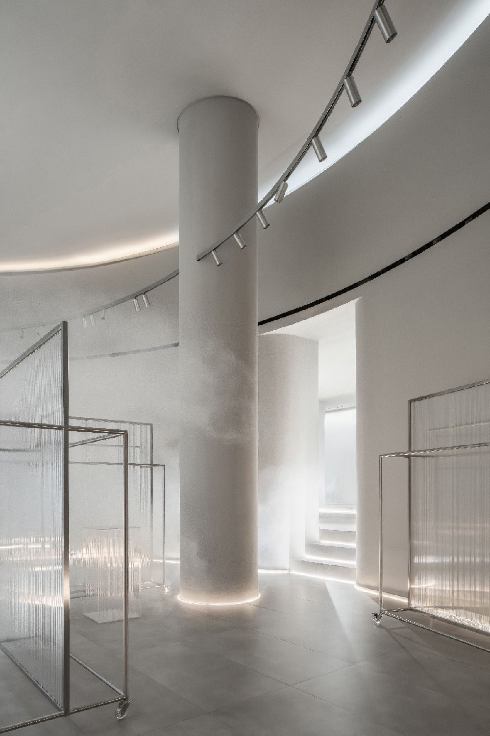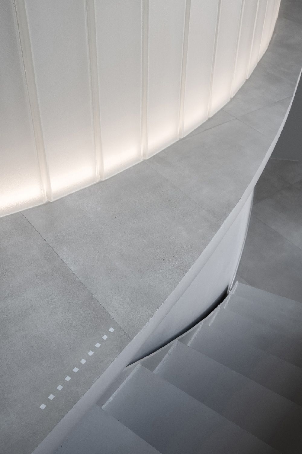 一层环形空间做了下沉处理,犹如古典音乐厅一般的空间关系,为进入多增添了几分仪式感,而外部环绕的楼梯又像一条带人们从中心处直通二楼的快速通道。