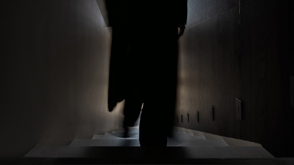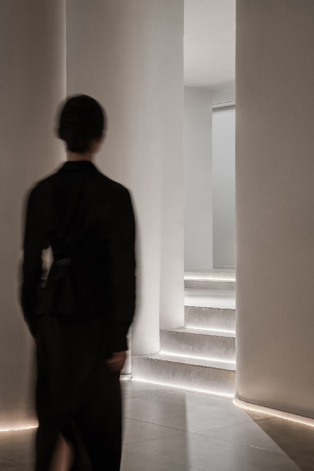 从入口处,经过一段狭长的走道后逐渐走入,此时需要下探几步才正式踏进豁然开朗的开放高挑的室内空间,若继续拾阶而上,可以直达二楼的会客茶室之中。