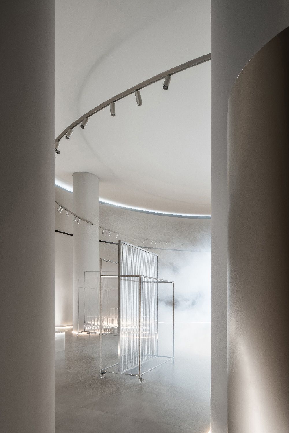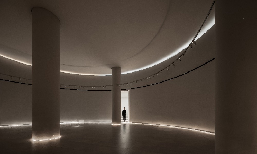 其中,横向悬置的长方体量构筑起建筑内外进出和垂直上下立体交通盒子,而竖向插入的通高中空圆柱体量则塑造了空间场所精神。