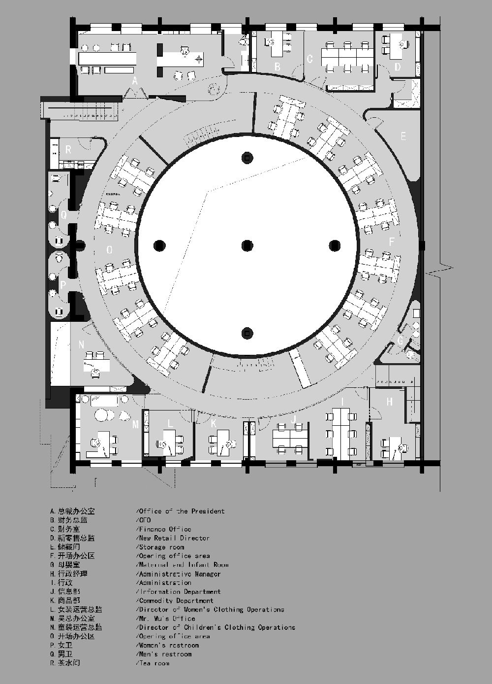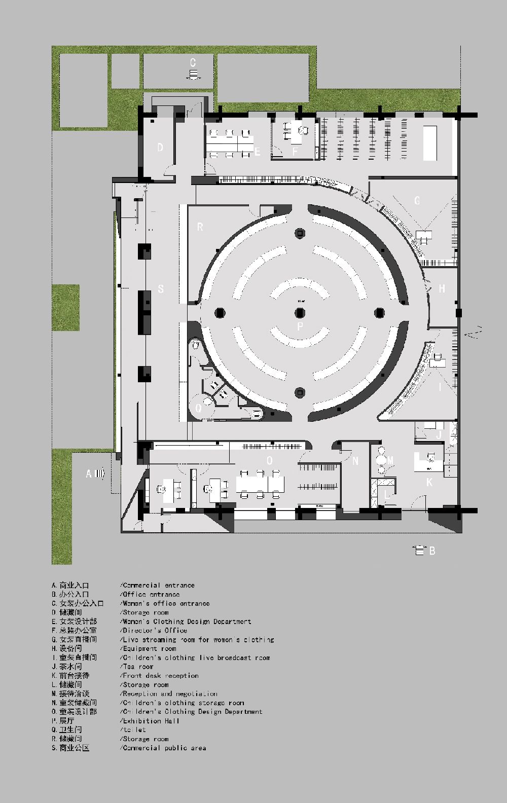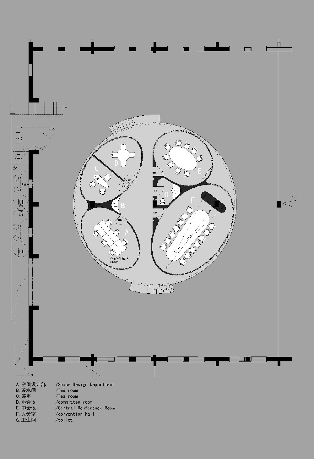 其上下两部分分别担任了多功能展示厅与洽谈会议的功能角色,四周环绕的开放办公区域彰显现代高效工作氛围。